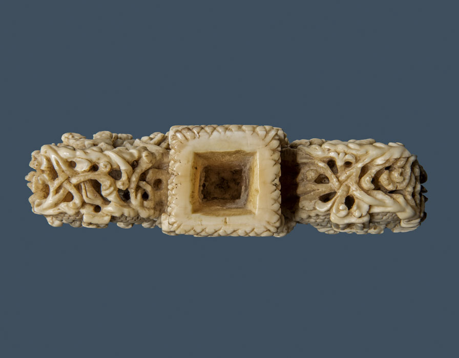 Impugnatura composta da una parte centrale intorno alla quale si sviluppano due lobi arrotondati, delimitati da un torciglione composto da steli e fogliami che si intrecciano proseguendo fino alla zona sottostante. Il profilo esterno è occupato dall'immagine dell'Agnus Dei, acciambellato entro medaglione, sorretto da angeli con le braccia tese. Sulle due facce laterali sono scolpite la Parabola del povero Lazzaro e del ricco epulone, da un lato, e la Parabola del buon samaritano, dall'altro. Il profilo inferiore è ornato da girali di tralci traforati e presenta un foro quadrato per l'inserimento di un'asta
