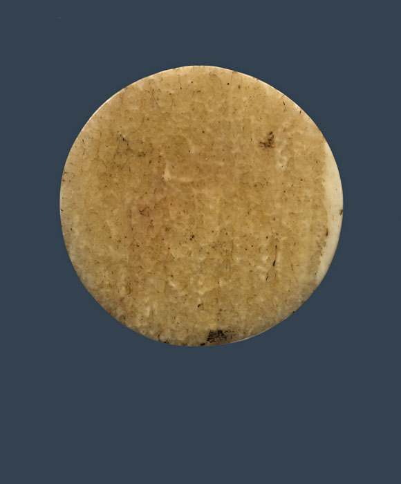 Pedina di forma circolare. Modanatura liscia, circoscrive un cerchio di grosse perle, al cui centro è raffigurato l'episodio della storia di Sansone, in Dalila gli taglia le chiome mentre egli dorme sulle sue ginocchia
