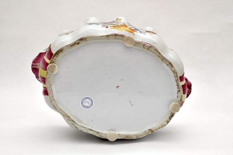 - NOTIZIE STORICO CRITICHE Rinfrescatoio 'seaux crénéles' Ginori manifattura di Doccia con smerlatura superiore ansata e profilata in oro e due prese laterali a rocailles. La forma curiosa di questi rinfrescatoi è probabilmente dovuta ad un'invenzione inglese del Seicento; sembra che i primi esemplari siano stati eseguiti in argento. Quando il rinfrescatoio veniva usato, lo si riempiva di ghiaccio, quindi si attaccavano i bicchieri col calice in basso per il piede infilando il gambo fra le scanalature del bordo. Questo rinfrescatoio, insieme ad altri tre analoghi, fa parte di un servito di porcellana costituito anche da una zuppiera, 12 piatti fondi, 15 piatti piani e 2 ciotole. Il servito riprende forma e decorazioni della porcellana cinese di esportazione, in particolare i decori "al tulipano" derivati dalla decorazione "alla peonia" e utilizzati particolarmente nel secondo periodo della manifattura (1758-1792). Il rinfrescatoio è stato realizzato nel secondo periodo della Manifattura di Doccia tra il 1770 e 1780. Ciò si deduce non solo dalla definitiva cristallizzazione del decoro, pur nelle variazioni apportate dal singolo decoratore, ma anche dall'uso della copertura stannifera, procedura adottata nel secondo periodo della Manifattura per non lasciare trasparire il color perlato del "biscotto" porcellanico, che rendeva la superficie delle stoviglie bianca splendente adatta a far risaltare la policromia del decoro e delle dorature