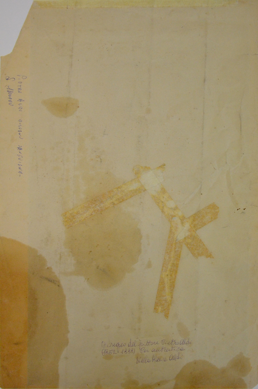 - NOTIZIE STORICO CRITICHE Il disegno dovrebbe appartenere al periodo in cui Pietro Aldi frequentava i corsi presso l'Istituto di Belle Arti di Siena e quindi eseguito nel periodo giovanile tra il 1864 e il 1874. Lo stile dal tratto assertivo, poco relazionabile con le opere conosciute di Piero Aldi, e le ripassature successive hanno indotto a dubitare sull'autografia del disegno, nonostante l'autentica sul verso. Ulteriori ricerche potranno avvalorare o meno l'ipotesi attributiva