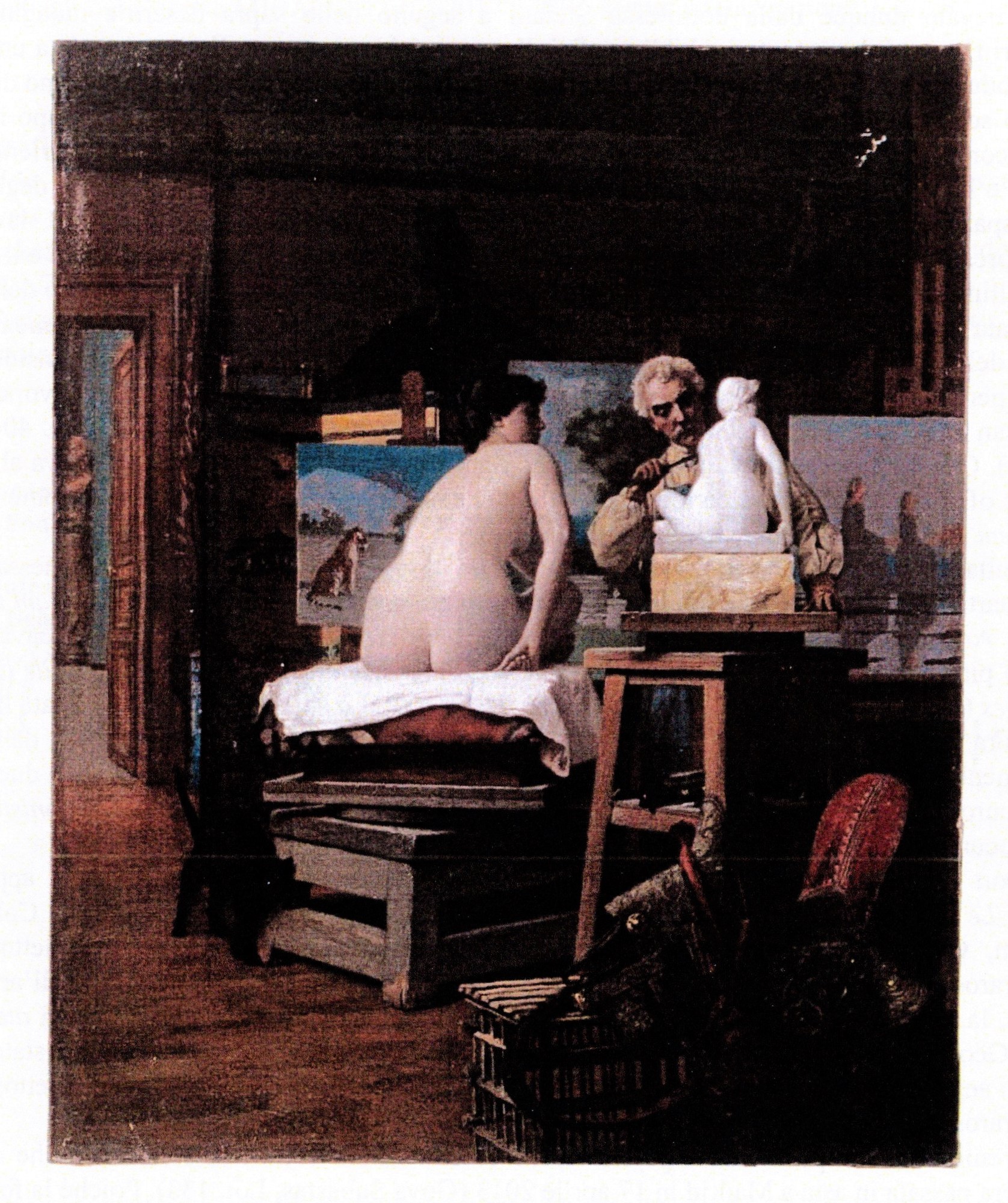 La tela rappresenta un interno di atelier con uno scultore al lavoro, mentre la modella, seduta di schiena, si sporge a guardare la scultura in corso d’opera