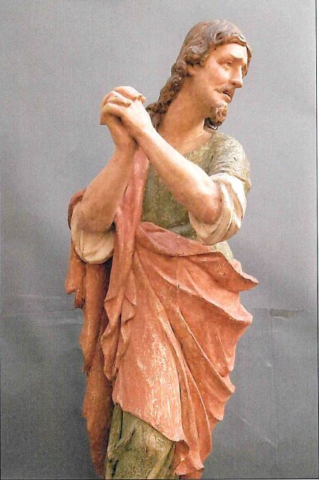 - NOTIZIE STORICO CRITICHE La figura maschile, identificata come san Giovanni, è parte di gruppo scultoreo, in origine un Compianto o una Deposizione dalla Croce, di ignoto autore. Tuttavia, il modellato di alta qualità ed alcune componenti stilistiche possono essere messe in relazione con la maniera di noti scultori lombardi attivi tra Cinquecento e Seicento. In particolare, la figura presenta puntuali assonanze con l’analoga raffigurazione dell’apostolo intagliata da Paolo Amatore per un il santuario della Maddalena a Bienno, in provincia di Brescia (opera oggi conservata a Palazzo Simoni Fè a Bienno)