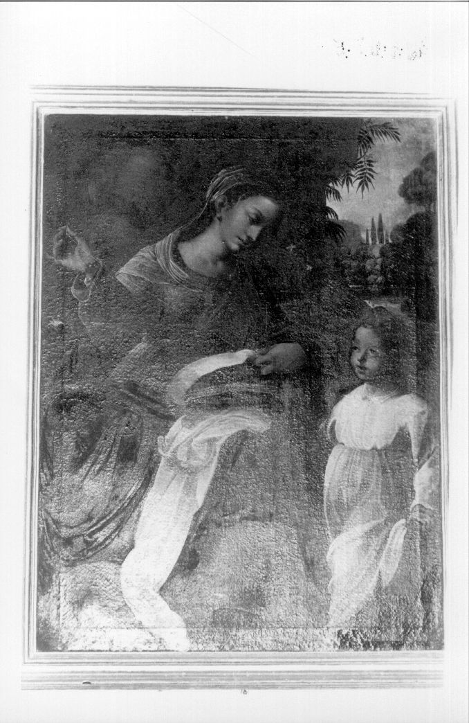 • NOTIZIE STORICO CRITICHE Il Guardabassi (1872, p.311) attribuisce l'opera al Barbiani, che compie in Stroncone una Madonna del Rosario nellachiesa di San Michele Arcangelo. Sempre il Guardabassi ricorda che in un manoscritto originale contenete varie memorie della famiglia Nevelli, si legge l'elenco dei quadri donati verso la metà del Seicento da Leonardo Nevelli a varie chiesa di Stroncone, ed è a proposito di questo scritto: "... Uno con cornice che sta in sagrestia ove è dipinta la Vergine SS.ma che cuce, con il figliolo ai piedi vicino a Lei, di pittura eccellente et è stimatissimo". Il Lanzi schedò il dipinto per conto del Ministero della Pubblica Istruzione, in data 2-11-1896, n.14 e lo cita poi nel (1882,p.22). Anche per il Lanzi il dipinto risente della maniera del Barbiani, del quale si conservano nel paese anche altri dipinti. Uno simile è nell'oratorio di San Filippo Neri