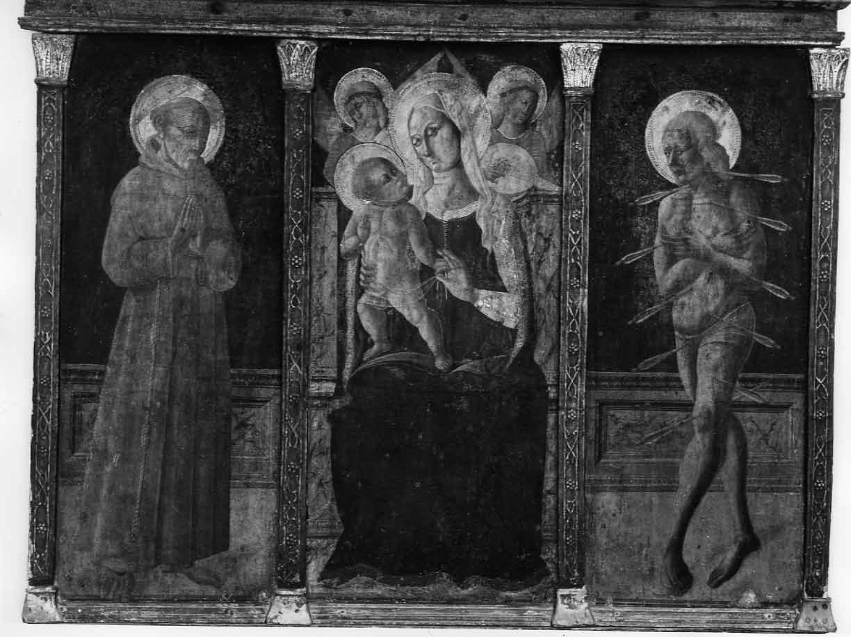 Trittico di forma rettangolare, diviso in tre pannelli da pilastrini con c apitelli a foglia d'acqua. Nella tavola centrale è ritratta la Vergine, as sisa in trono, che reca sulle ginocchia il Bambino, eretto in piedi nudo. Oltre la spalliera del seggio si affacciano due angeli musicanti. Nel pann ello sinistro è S. Francesco; nel destro S. Sebastiano, colpito da innumer i frecce