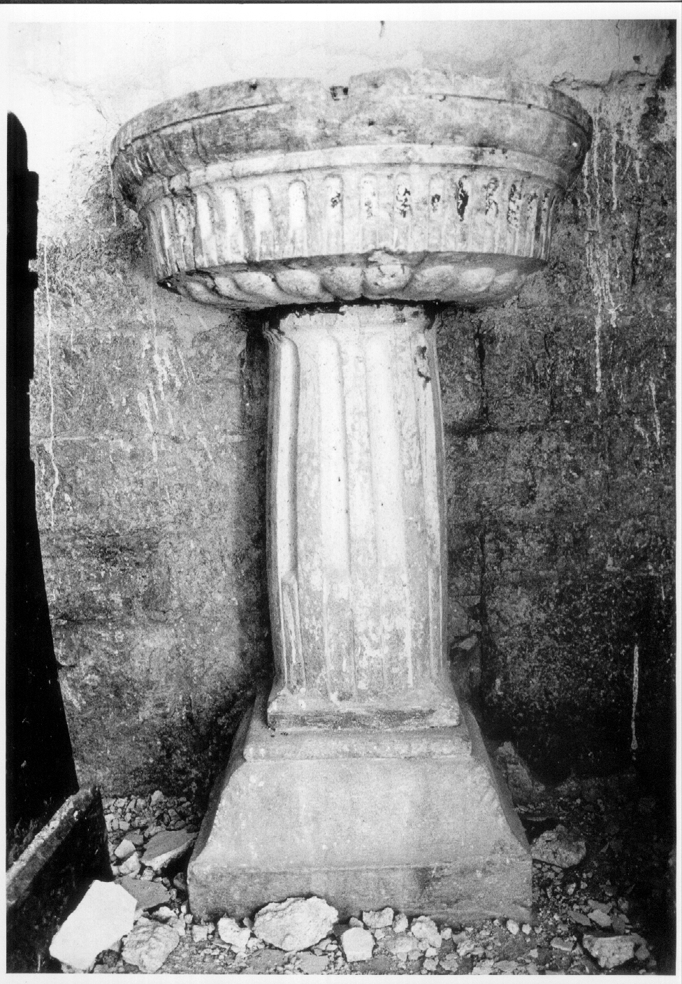 Su base modanata liscia, si alza il fusto circolare scanalato e rudentato, su cui poggia la vasca, incassata nel muro, decorata con una fascia a scanalature