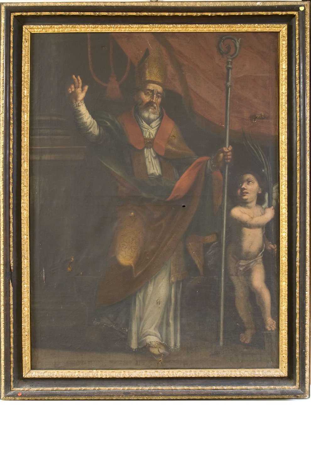 Tela rettangolare con cornice. UN Santo vescovo martire, stante e benedicente, è affiancato da un angelo che regge la palma del martirio,. Sullo sfondo è riconoscibile, a sinistra, un colonna su stilobate; a destra un tendaggio rosso
