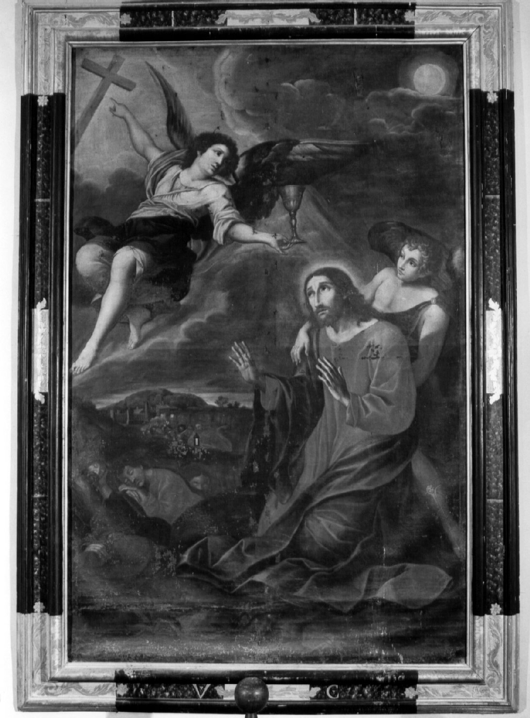 Personaggi: Gesù Cristo; Apostoli. Paesaggi: orto degli ulivi. Figure: Angeli. Luna. Simboli: croce; calice