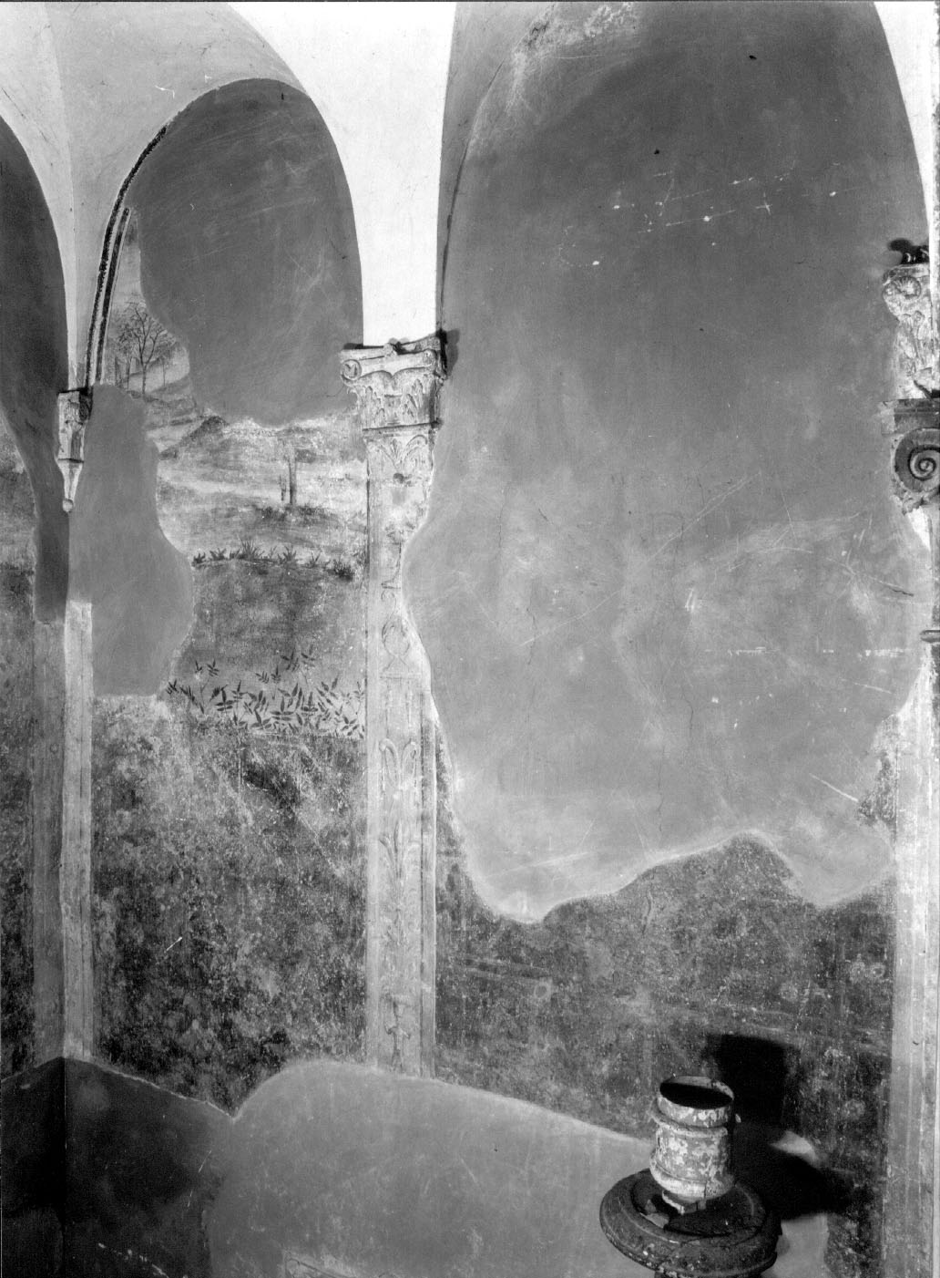 - NOTIZIE STORICO CRITICHE La cappella di Costantino Eroli è unita a quella del nipote Francesco, iniziata prima del 1500 ed officiata nel 1535, tramite un vestibolo dove furono collocati i monumenti sepolcrali dei due illustri prelati, demoliti nel 1563 (Toscano,1963,p.147; AA.VV.,1978,p.336). Le pareti del piccolo sacello sono scandite da paraste con capitelli corinzi e sono completamente affrescate con immagini di paesaggi oggi assai rovinati