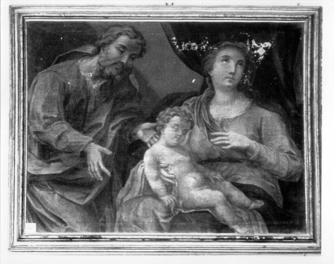 La Madonna ha il Bambino in grembo affiancata a sinistra da San Giuseppe. Sullo sfondo è un tendaggio scuro. La tela è montata su una cornice dorata dello spessore di cm. 8