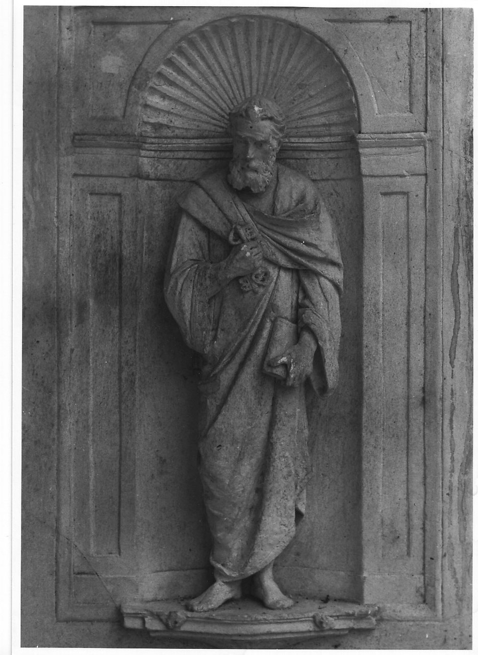 Nella formella è raffigurato S. Pietro, ad altorilievo, o ritto su un piccolo basamento sporgente e inserito in una nicchia conclusa da una conchiglia, riquadrata da un prospetto ornato con specchiature