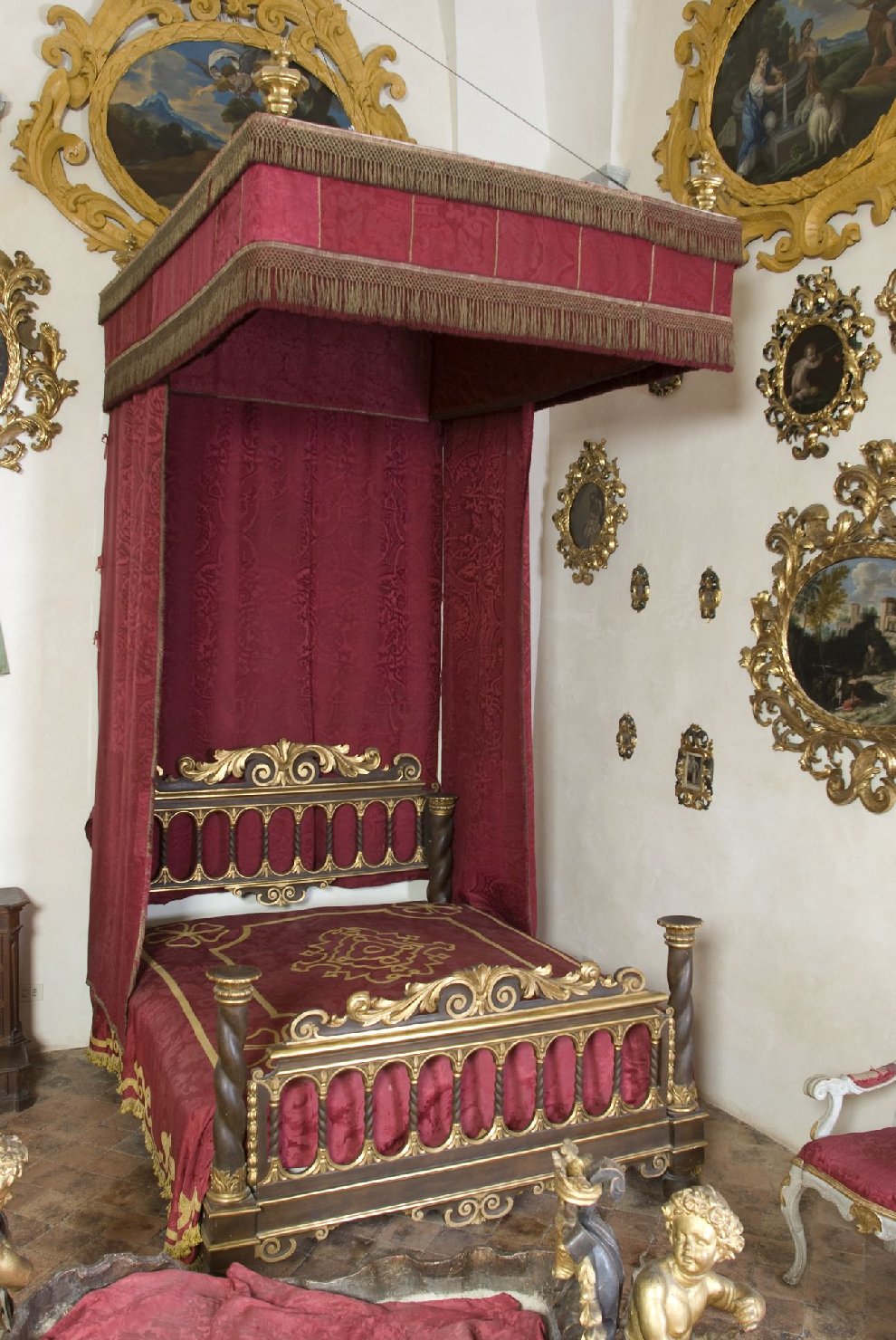 Spalliera e sponda a colonna con archi dorati sormontati da fregio di motivi floreali e due volute centrali di colo oro. Ai quattro angoli, colonna portante ritorta con base a forma di palla e il capitello dorato. Sopra il letto, il baldacchino fissato al muro e rivestito di tessuto rosso con motivi floreali e frange; ad ogni suo angolo soprelevato, forma di vaso di legno dorato
