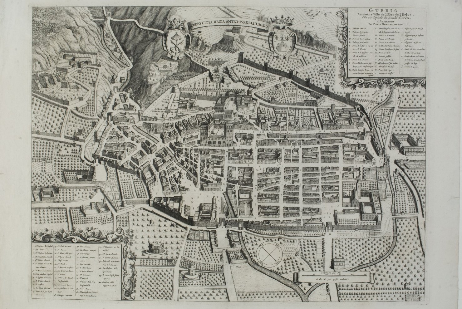 - NOTIZIE STORICO CRITICHE La stampa proviene dalla Soprintendenza ai Beni Artistici, Archeologici, Architettonici ed è stata trasferita alla Galleria con nota n.° 16000 del 12 luglio 1996. E' una veduta di Gubbio dall'alto; in essa sono definite vie, palazzi, chiese e monasteri, contraddistinti da numeri e lettere. L'opera, come si legge sull'iscrizione, è da riferire al cartografo olandese Pierre Mortier