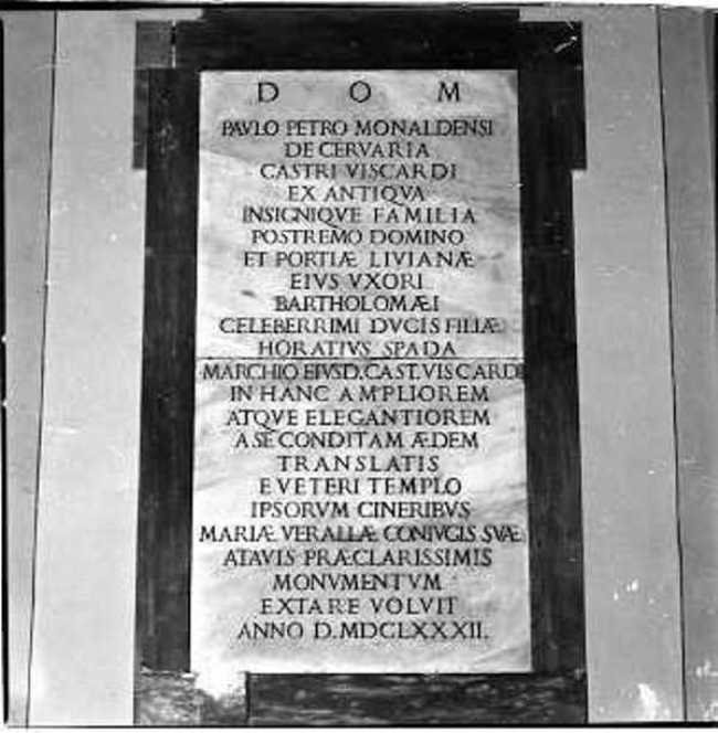 - ISCRIZIONI DOM/ PAULO PETRO MONALDINSI DE CERVARIA/ CASTRI VISCARDI/ EX ANTIQUA/ INSI GNIQUE FAMILIA/ POSTREMO DOMINO/ ET PORTIAE LIVIANAE/ EIUS UXORI/ BARTHOL O MAEI/ CELEBERRIMI DUCUS FILIAE/ HORATIUS SPADA/ MARCHIO EIUSD. CAST. VIS CARDI/ IN HANC AMPLIOREM/ ATQUE ELEGANTIOREM/ A SE CONDITAM AEDEM/ TRANSLA TIS/ E VETERI TEMPLO/ IPSORUM CINERIBUS/ MARIAE VERALLAE CONIUGIS SUAE/ AT AV IS PRAECLARISSIMIS/ MONUMENTUM/ EXTARE VOLUIT/ ANNO D.MDCLXXXII - lettere capitali -
