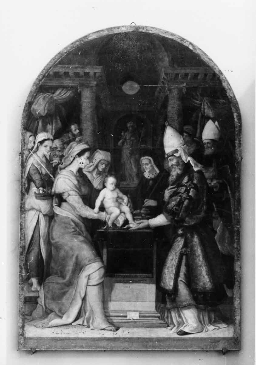 Personaggi: Madonna; Gesù Bambino; San Simeone; Sant'Anna; abbadessa. Figure maschili: popolani. Ecclesiastici: sacerdoti. Personificazioni: fede. Attributi: (San Simeone) abito sacerdotale; ara. Attributi: (Popolana) cesto con animali. Attributi: (Abbadessa) abito monacale; croce. Attributi: (S acerdote) abito sacerdotale; libro. Attributi: (Fede) calice; croce. Oggetti: ara; vaso; cesto; cartiglio