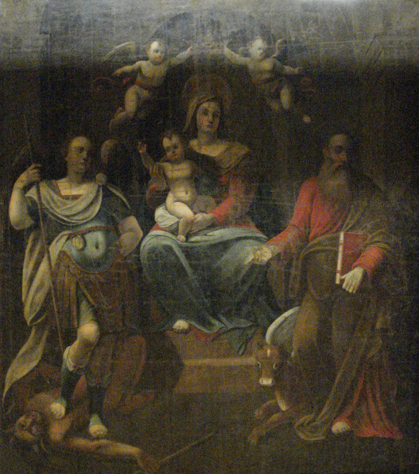 Sacra conversazione con la Madonna in trono col Bambino, incoronata da due cherubini. San Michele Arcangelo, sulla sinistra, calpesta il demonio; San Luca Evangelista, sulla destra, ha il bue alato ai suoi piedi. Sfondo scuro uniforme