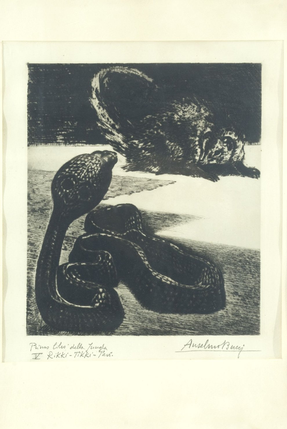 - NOTIZIE STORICO CRITICHE Le sei opere sono state individuate durante il riscontro inventariale del deposito inferiore, nell'agosto del '99; erano conservate in uno scatolone assieme ad altre stampe provenienti dall'Avvocatura Generale dello Stato come segnalava un'etichetta sulla cassa, mentre per alcune di queste è stata rintracciata la documentazione relativa al deposito presso l'Avvocatura, avvenuto nel 1952, quelle in questione vengono citate soltanto nel verbale di consegna del 30.09.1992. Raffigurano episodi tratti dal libro della Jungla di R.Kipling. L'autore, Anselmo Bucci, è stato tra i fondatori dell'Associazione Incisori d'Italia e fu tra i fondatori del movimento del Novecento con Dudreville, Malerba, Marussig, Sironi e Funi ( Cfr. F. Caroli, ad vocem, in: Bolaffi, vol.II, 1972). Le stampe, in puntasecca su carta giapponese, risalgono al 1925. Non si conosce la tiratura ma nel 1926 la serie completa di otto esemplari (mancano quelle intitolate Al servizio della regina e Mowgli) fu esposta alla Biennale di Venezia nella Sezione del "Bianco e nero"