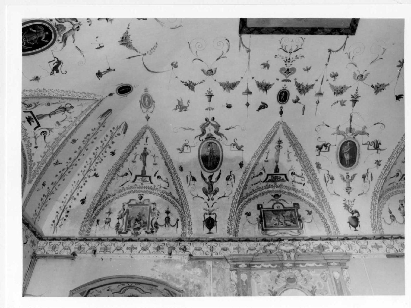 Da sn, motivo di fusto con spiga di granturco ed edera attorta; uccelli ch e beccano foglie nella lunetta sn, tra teste di putto e nastri, riquadro con cornice sagomata ed arpie addossate, includente paesaggio naturalistic o con albero, a ds in primo piano, presso cui Dio Padre con barba bianca e lunga veste distacca Eva dal corpo di Adamo nella vela, su basamento sovr apposto a cigno, trimonte su cui poggia la Fama come figura femminile reca nte nella ds corona d'alloro al centro: testina alata tra festoni; vaso fi orito; drago alato e uccello in volo; 2 arpie affrontate su mascherone; cl ipeo con figura di agricoltore con copricapo a falda e falce nella sn 2 ca ni su scala che trattengono festone; arpia tra gru, su anfora con elementi vegetali nella lunetta ds, tra nastri tirati da uccelli in volo, paesaggi o con Adamo, in primo piano a sn, rivolto verso Eva, a ds, presso albero c ompreso tra 2 fiumi nella vela, su trimonte, la Speranza che reca cesto di fiori sul capo