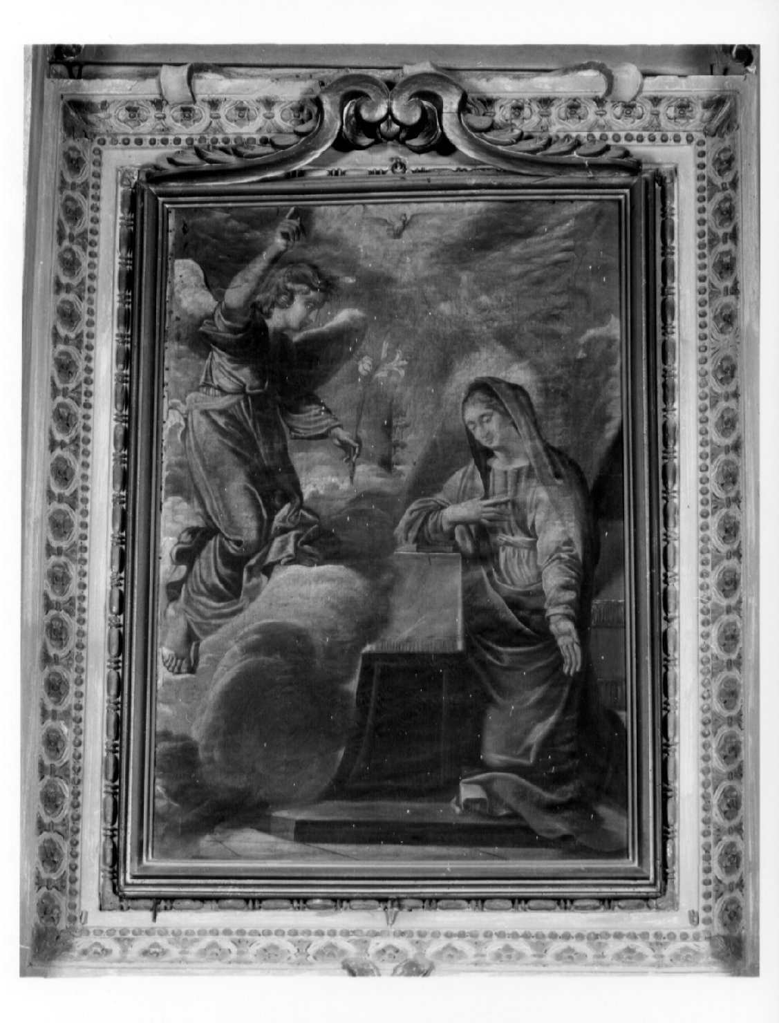 Personaggi: Vergine Maria; San Gabriele Arcangelo. Simboli: colomba dello Spirito Santo. Mobilia: inginocchiatoio