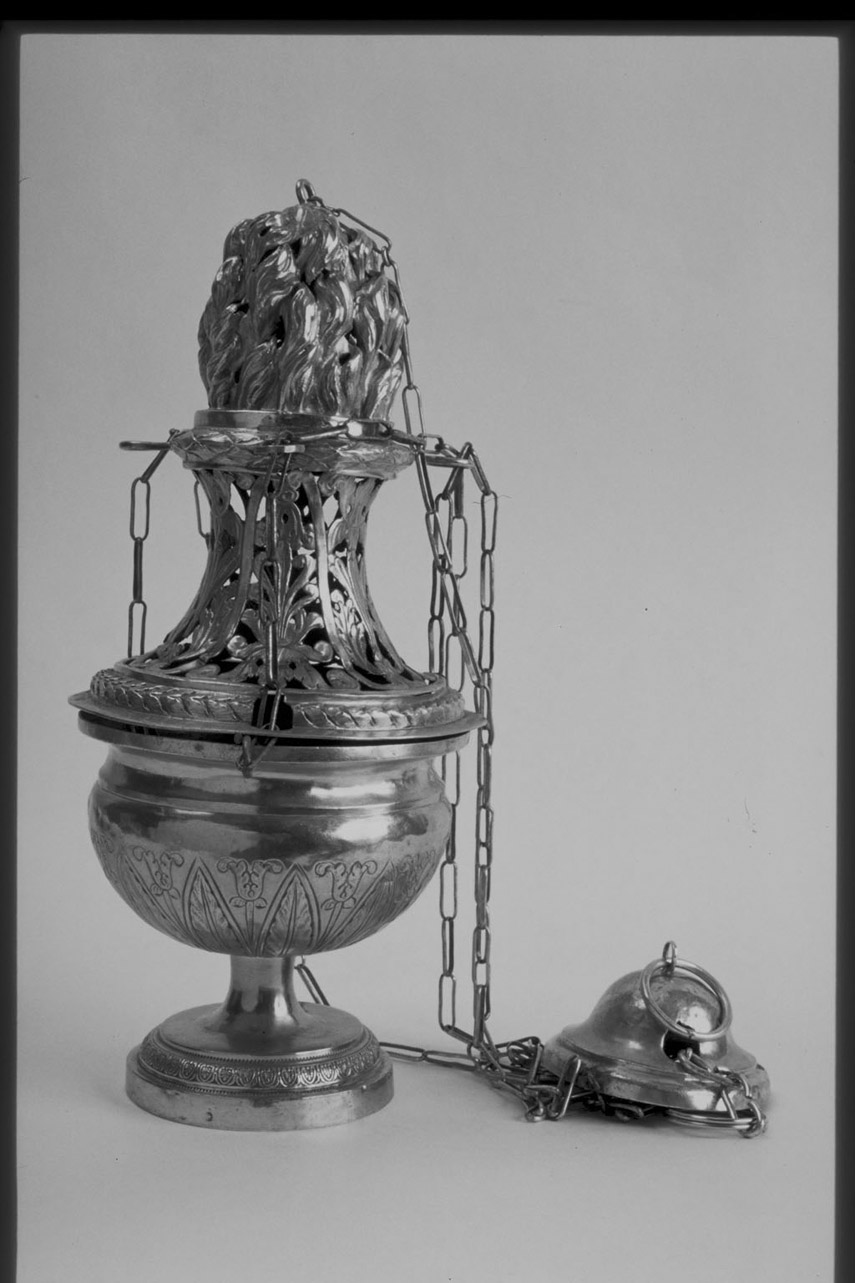 Incensiere lavorato, a vaso fiammeggiante. Il piede circolare è impostato su un bordino rialzato, reca una fascia lavorata a palmette poste entro u n bordino a cordolo, raddoppiato e aperto in corrispondenza della base del la palmetta. Il corpo del vaso ha un decoro a sbalzo molto basso, svilupp ato in senso lineare con un disegno consistente in foglie lanceolate entro bordino, con nervature, alternate a elementi floreali di fantasia, culmin anti in una doppia foglia di acanto. Sull' orlo del vaso, a bordino rialz ato, poggia la tesa del coperchio; oltre un serto di foglie, esso è diviso in settori da listelli lisci e traforato con motivi vegetali a palmetta e splosa. La parte terminale, oltre un rigonfio serto di alloro, consiste n ella fiamma che caratterizza la tipologia del turibolo