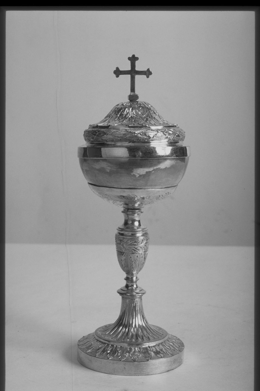 Pisside tonda lavorata. Piede su alto bordino, corpo recante una cornice molto ampia con foglie lanceolate percorse da nervature su fondo puntinato . Il collo del piede, rialzato su un gradino, è lavorato a strigilature r adiali, decrescenti di spessore verso il fusto ove si raccolgono in un nod ino dal profilo modanato. Il nodo principale è a vaso, a foglie lanceolat e nervate, disposte in verticale per poco più della metà del nodo; la part e superiore è occupata da una fascia ove il motivo decorativo, a foglie di sposte ai lati di un arbusto diritto, corre orizzontalmente. Il nodino su periore a tronco di cono strozzato immette all' esiguo sottocoppa, a marg ine diritto e lavorato a incisioni con foglie lobate disposte in festoni. La coppa è in argento, svasata; il coperchio è bloccato alla coppa tramit e un alto bordino, oltre il quale è presente un serto di alloro, sovrastat o da una cupoletta lavorata a foglie nervate. Crocetta apicale, latina, a terminazioni trilobate, di restauro