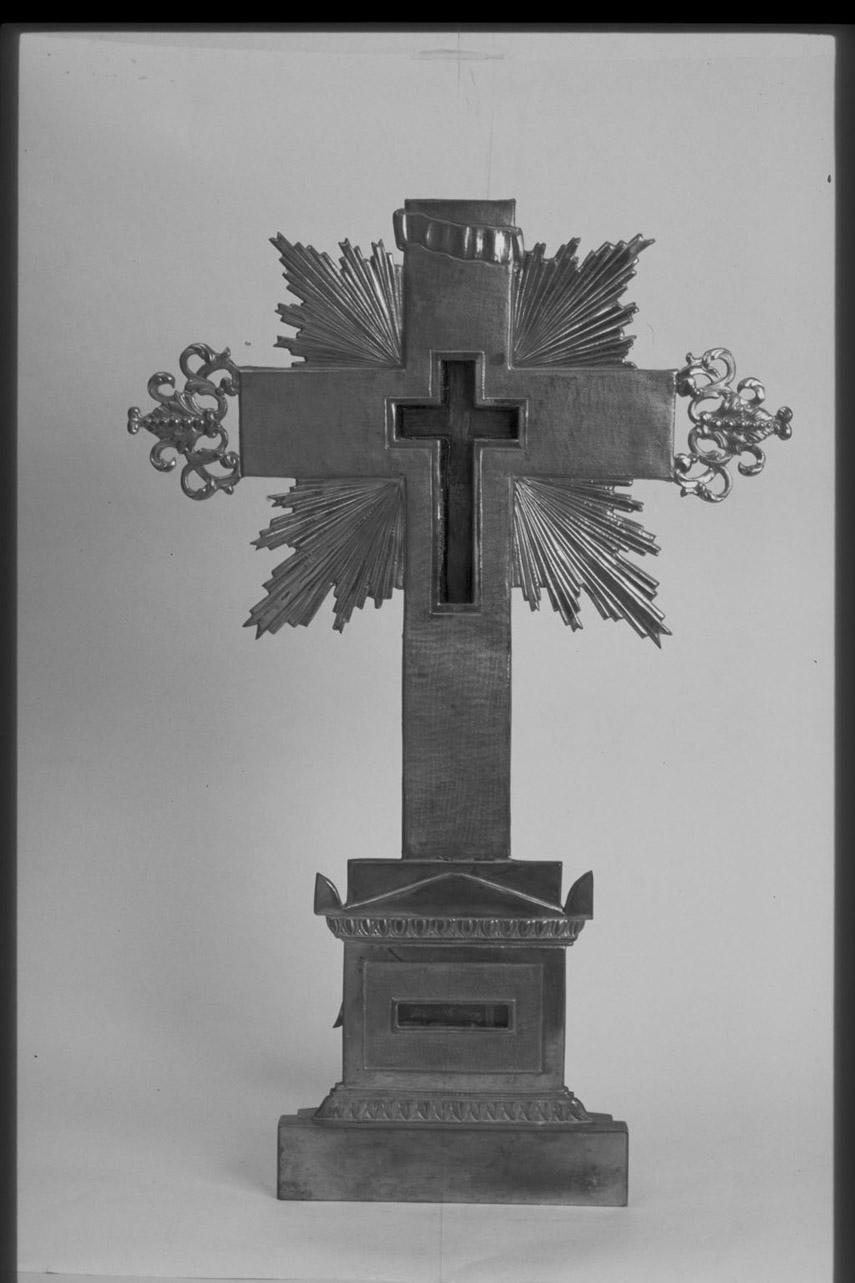 Reliquario architettonico. Sulla base rettangolare liscia poggia un plint o dal bordo trapezoidale inciso con foglie a punta, percorse da nervatura centrale. Al di sopra, una specchiatura a rilievo, traforata con un riqua dro rettangolare protetto da vetro oltre il quale è un frammento della ve ra croce. Un cornicione a gusci diritti immette al frontone triangolare, affiancato da elementi a semicerchi piegati ad angolo. La croce interame nte percorsa da bulinatura incrociata, si sviluppa da una base rettangolar e. All' incrocio dei bracci sono elementi di raggiera, più sviluppati que lli inferiori. I bracci corti sono conclusi con un fregio a volute, fogli a e perlatura. Il titulus "INRI" è ricavato su una lastra lucida ondulata . All' incrocio dei bracci sta internamente una traforatura con bordino l iscio, che lascia intravedere l' interno della teca cruciforme che ospita la reliquia della Vera croce della quale ha la forma