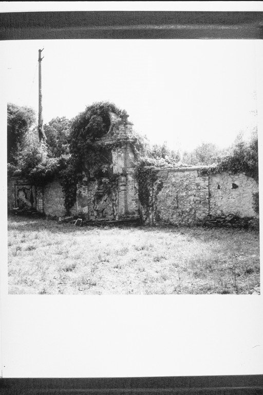 recinzione perimetrale in murature mista intonacata, con scansioni vertica li a rilievo/ decorazioni a mosaico in pietre bianche e nere sulla superfi cie muraria/ includente fontana a muro