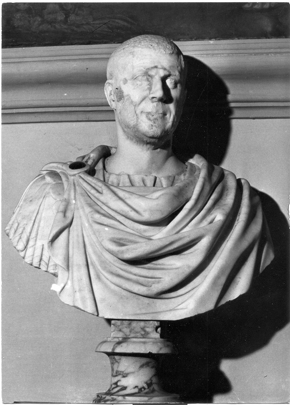 - NOTIZIE STORICO CRITICHE Falcida G., Sapori G. (1987) citano numerosi "Imperatori romani", attribuendo alle teste, quasi sempre, l'epoca romana mentre per i busti le datazioni cambiano. Rossi G. (2008), nel pannello didattico del Salone, detta anche Sala del Trono (n. 20), parla della testimonianza dell'antica gloria del mondo romano, testimoniata dalla serie dei busti di epoca romana e rimaneggiati nella metà del sec. XVI, quando da Roma vennero portati al Castello Bufalini per decorare i camini, per essere ubicate sopra le porte e i prospetti architettonici. Confrontando l'inventario di Bacoccoli R. (2012) con la descrizione che se ne fa nella ricognizione patrimoniale del 1987, ne viene fuori l'identificazione probabile con vari pezzi