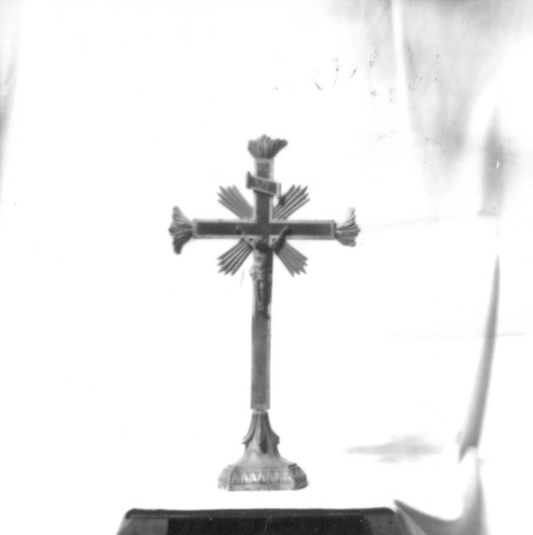 La croce argentata, di semplice fattura, si arricchisce al termine dei bracci di espansioni fogliacee dorate e di una raggiera centrale che evidenzia la figura del Cristo, anch'essa in legno dorato, con il capo reclinato sull'omero destro