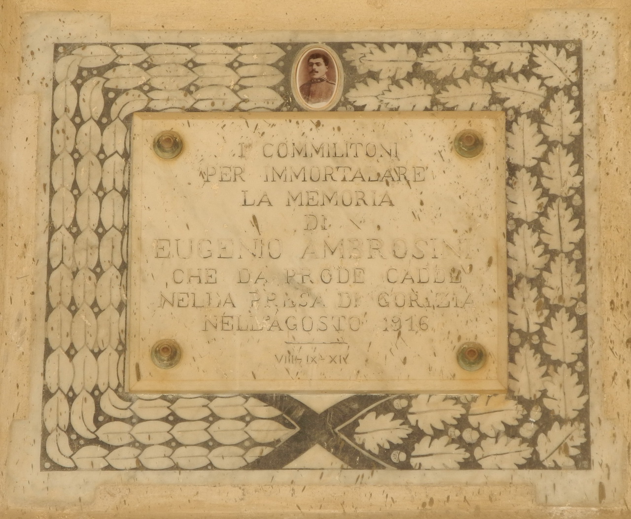 - ISCRIZIONI nel campo - I COMMILITONI/ PER IMMORTALARE/ LA MEMORIA/ DI/ EUGENIO AMBROSINI/ CHE DA PRODE CADDE/ NELLA PRESA DI GORIZIA/ NELL'AGOSTO 1916/ VIII-IX-XI - maiuscolo - a incisione -