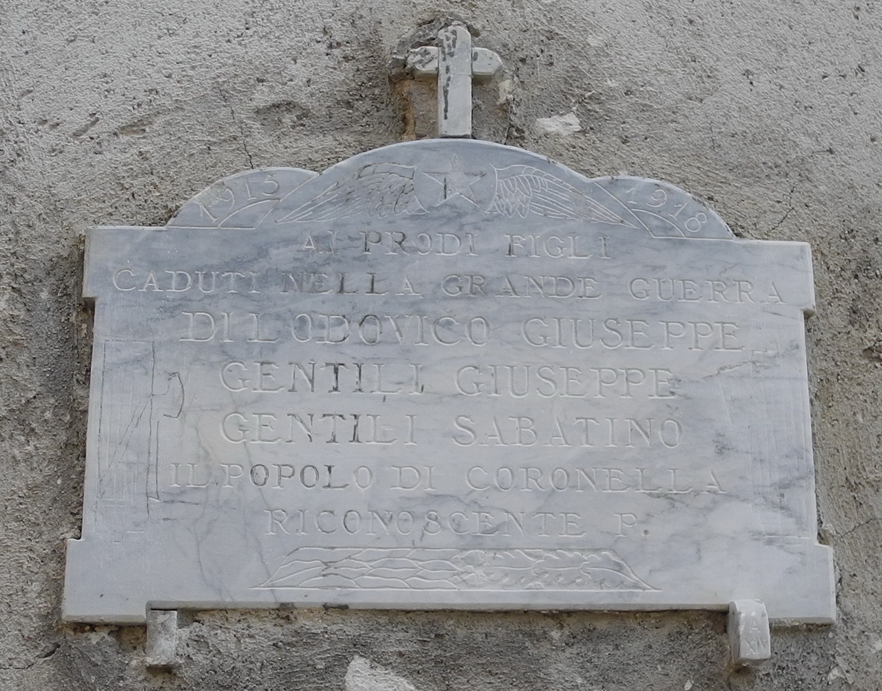 - ISCRIZIONI nel campo - 1915/ 1918/ AI PRODI FIGLI/ CADUTI NELLA GRANDE GUERRA/ DI LODOVICO GIUSEPPE/ GENTILI GIUSEPPE/ GENTILI SABATINO/ IL POPOLO DI CORONELLA/ RICONOSCENTE P.[OSE] - maiuscolo - a incisione -
