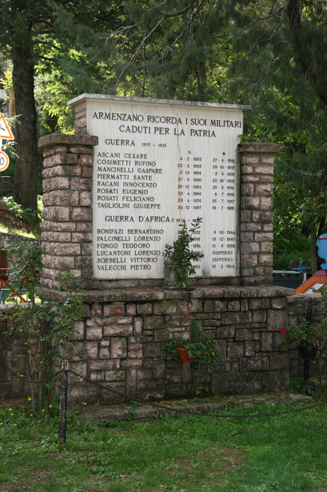 - ISCRIZIONI nella lapide - Armenzano ricorda i suoi militari/ caduti per la patria/ Guerra 1915-1918/ Ascani Cesare 4-2-1893 27-6-1918/ Cosimetti Rufino 22-2-1893 28-10-1915/ Mancinelli Gaspare 3-12-1896 2-6-1916/ Piermatti Sante 17-5-1890 23-10-1915/ Racani Innocenzo 29-12-1894 23-8-1918/ Rosati Eugenio 30-4-1896 6-7-1916/ Rosati Feliciano 29-4-1876 25-7-1917/ Tagliolini Giuseppe 24-12-1897 18-7-1918/ Guerra d'Africa e 1940-1945/ Bonifazi Bernardino 29-1-1922 8-10-1944/ Falcinelli Lorenzo 29-10-1919 15-12-1940/ Fongo Teodoro 9-4-1914 11-9-1939/ Lucantoni Lorenzo 10-10-1923 disperso/ Sorbelli Vittorio 14-1-1921 disperso/ Valecchi Pietro 2-1-1918 13-2-1944 - capitale -