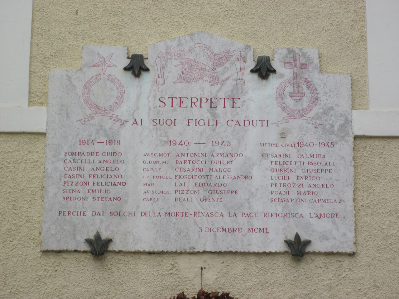 - ISCRIZIONI nella lapide - STERPETE/ AI SUOI FIGLI CADUTI/ 1914-1918/ BOMPADRE GUIDO/ CASCELLI ANGELO/ CASINI ANGELO/ CASINI FELICIANO/ PIZZONI FELICIANO/ SIENA EMILIO/ SPERONI STEFANO/ 1940-1945/ AV(IERE) SC(ELTO) MOT(ORISTA) ANTONINI ARMANDO/ G(UARDIA) D'ON(ORE) M(---) BARTOCCI DUILIO/ CAP(ORA)LE CESARINI MARCO/ (CAPORALE) FOTOEL(ETTRICISTA) FIORDIPONTI ALESSANDRO/ MAR(ESCIALLO) LAI EDOARDO/ AV(IERE) SC(ELTO) MOT(ORISTA) PIZZONI GIUSEPPE/ CAP(ORA)LE REALI ORESTE/ VITTIME CIVILI 1940-1945/ CESARINI PALMIRA/ FELICETTI PASQUALE/ GUBBINI GIUSEPPE/ LUCIDI ENRICO/ PETROZZI ANGELO/ ROANI MARIO/ SCIAVARTINI CARMELA/ PERCHE' DAI SOLCHI DELLA MORTE - RINASCA LA PACE - RIFIORISCA L'AMORE/ 3 DICEMBRE MCML - capitale -