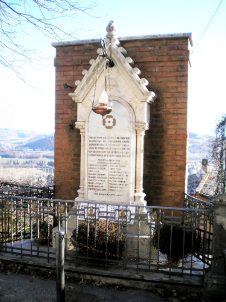 - ISCRIZIONI sulla lapide - Roscini Alessandro (seguono i nomi dei caduti della prima guerra mondiale su due colonne) colonna di sinistra: Bircolotti Eugenio, Bircolotti Giulio, Bravi Icilio, Farabbi Casimiro, Farabbi Vincenzo, Mariucci Attilio, Rossi Artemio, Rossi Mariano, Rumeni Galliano / colonna di destra Simonini Silvio, Sorbi Tito, Sollevanti Marsilio, Pagliacci Sigismondo, Tacconi Severino, Taffini Aurelio, Verducci Guido, Verducci Marino / MCMXV- MCMXVIII / XXIII GENNAIO MCM XXVII ANNO V. Nella seconda lapide aggiunta in epoca successiva si legge: VITTIME CIVILI DI GUERRA 1944 Colonna di sinistra: Becchetti Franco, Bovini Stella, Camilloni Claudio, Camilloni Giuseppa, Rondini Adolfo, Ricci Giancarlo, Colonna di destra:Ricci Giuseppe, Ricci Maria, Ricci Anna, Ricci Vittoria, Salari Giuseppa, Secchi Felice - non determinabile -