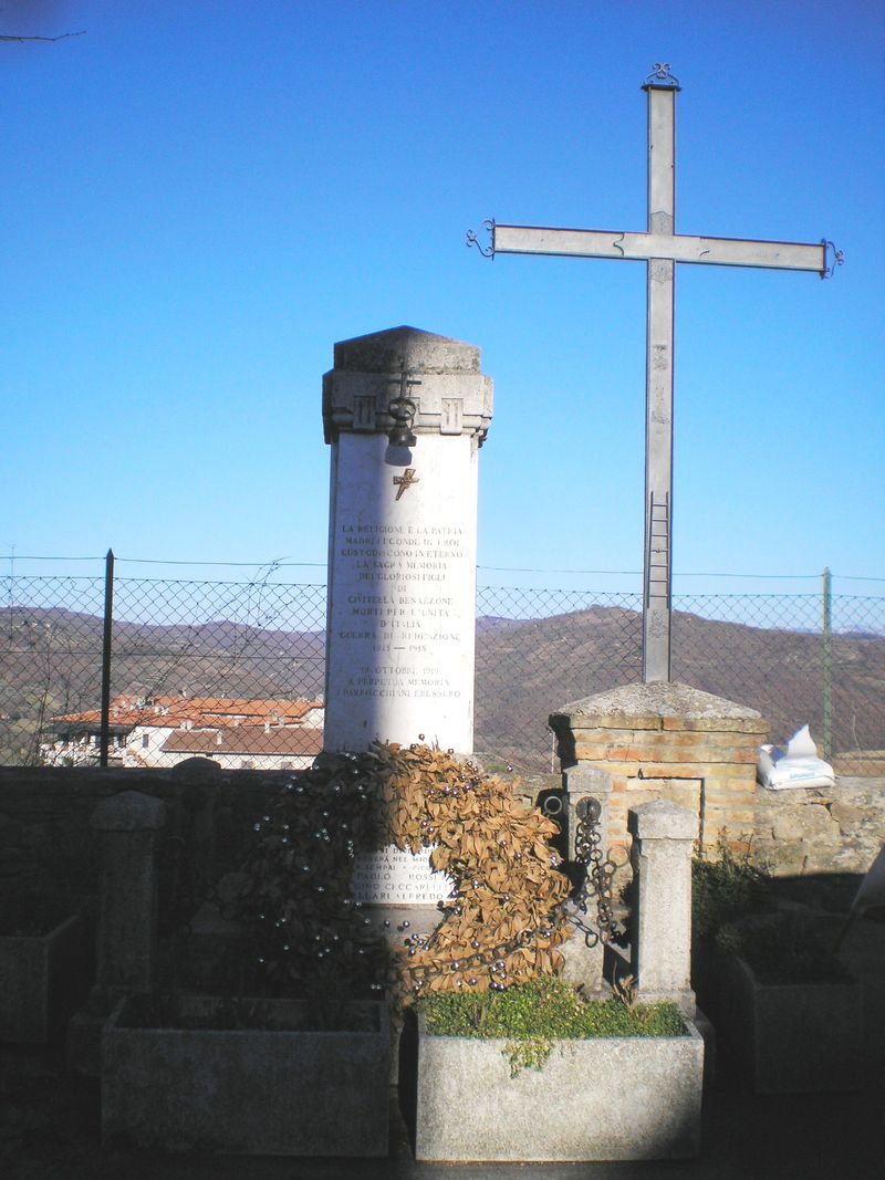 - NOTIZIE STORICO CRITICHE Il monumento venne eretto il 19 ottobre 1919. Recentemente è stato posto accanto un crocifisso di semplice fattura. Nota del revisore [2016] Presso l'Archivio di Stato di Perugia è conservata una lettera del 10 ottobre 1919 in cui si invita il Regio Commissario all'inaugurazione del monumento ai caduti, che si terrà il 19 ottobre alle ore 15 (il documento è riportato nel campo fonti e documenti)