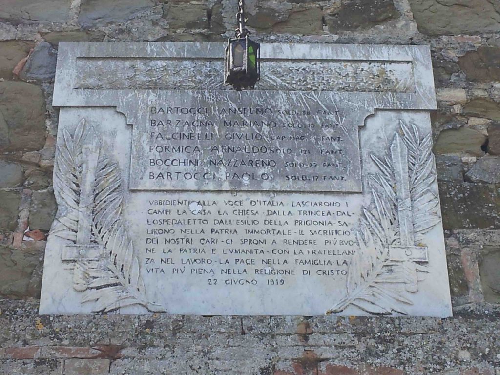- ISCRIZIONI su tutta la lapide - BARTOCCI ANSELMO SOLD. 86 FANT. BARZAGNA MARIANO SOLD. 10 FANT. FALCINELLI GIULIO CAP. MAG. 11 FANT. FORMICA ARNALDO SOLD. 124 FANT. BOCCHINI NAZZARENO SOLD. 97 FANT. BARTOCCI PAOLO SOLD. 17 FANT. UBBIDIENTI ALLA VOCE D'ITALIA LASCIARONO I CAMPI LA CASA LA CHIESA DALLA TRINCEA DALL'OSPEDALETTO DALL'ESILIO DELLA PRIGIONIA SALIRONO NELLA PATRIA IMMORTALE IL SACRIFICIO DEI NOSTRI CARI CI SPRONI A RENDERE PIU' BUONE LA PATRIA E L'UMANITA' CON LA FRATELLANZA NEL LAVORO LA PACE NELLA FAMIGLIA LA VITA PIU' PIENA NELLA RELIGIONE DI CRISTO 22 GIUGNO 1919 - a incisione -