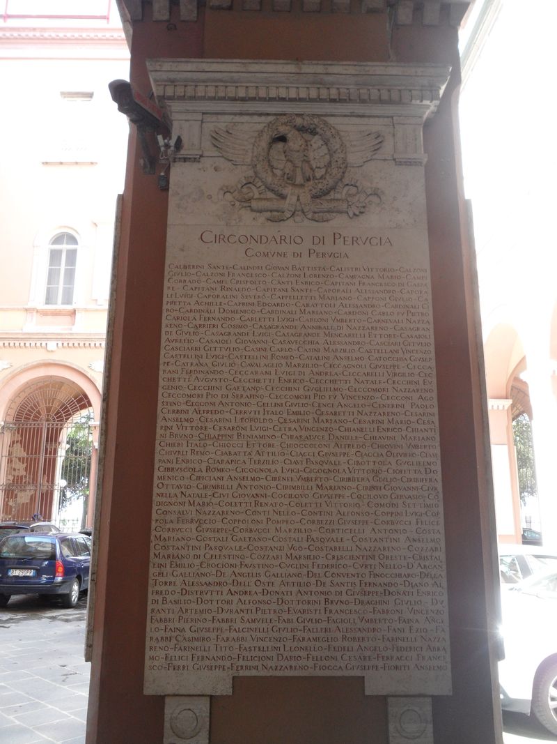 - ISCRIZIONI su tutta la lapide - CIRCONDARIO DI PERUGIA: COMUNE DI PERUGIA: CALDERINI SANTE-CALINDRI GIOVAN BATTISTA-CALISTRI VITTORIO-CALZONI GIULIO-CALZONI FRANCESCO-CALZONI LORENZO-CAMPAGNA MARIO-CAMPI CORRADO-CAMPI CRISPOLTO-CANTI ENRICO-CAPITANI FRANCESCO DI GASPARE-CAPITANI RINALDO-CAPITANI SANTE-CAPORALI ALESSANDRO-CAPORALI LUIGI-CAPORALINI SEVERO-CAPPELLETTI MARIANO-CAPPONI GIULIO-CAPRETTA ACHILLE-CAPRINI EDOARDO-CARATTOLI ALESSANDRO-CARDINALI CIRO-CARDINALI DOMENICO-CARDINALI MARIANO-CARDONI CARLO FU PIETRO-CARIOLA FERNARDO-CARLETTI LUIGI-CARLONI UMBERTO-CARNEVALI NAZZARENO-CARRIERI COSIMO-CASAGRANDE ANNIBALE DI NAZZARENO-CASAGRANDE GIULIO-CASAGRANDE LUIGI-CASAGRANDE MENCARELLI ETTORE-CASAIOLI AURELIO-CASAIOLI GIOVANNI-CASAVECCHIA ALESSANDRO-CASCIARI GETULIO-CASCIARRI GETTULIO-CASINI CARLO-CASINI MARSILIO-CASTELLANI VINCENZO-CASTELLINI LUIGI-CASTELLINI ROMEO-CATALINI ANSELMO-CATOCCHIA GIUSEPPE-CATRANA GIULIO-CAVALAGLIO MARZILIO-CECCAGNOLI GIUSEPPE-CICCARANI FERDINANDO-CECCARANI LUIGI DI ANDREA-CECCARELLI VIRGILIO-CECCHETTI AUGUSTO-CECCHETTI ENRICO-CECCHETTI NATALE-CECCHINI EUGENIO-CECCHINI GAETANO-CECCHINI GUGLIELMO-CECCOMORI NAZZARENO-CECCOMORI PIO DI SERAFINO-CECCOMORI PIO FU VINCENZO-CECCONI AGOSTINO-CECCONI ANTONIO-CELLINI GIULIO-CENCI ANGELO-CENERINI PAOLO-CERBINI ALFREDO-CERRUTI ITALO EMILIO-CESARETTI NAZZARENO-CESARINI ANSELMO-CESARINI LEPOLDO-CESARINI MARIANO-CESARINI MARIO-CESARINI VITTORE-CESARONI LUIGI-CETRA VINCENZO-CHIANELLI ENRICO-CHIANTINI BRUNO-CHIAPPINI BENIAMINO-CHIARALUCE DANIELE-CHIAVINI MARIANO—CHIERI ITALO-CHIOCCI ETTORE-CHIOCCOLONI ALFREDO-CHIOVINI UMBERTO-CHIURLI REMO-CIABATTA ATTILIO-CIACCI GIUSEPPE-CIACCA OLIVIERO-CIAMPANI ENRICO-CIARAPICA TERZILIO-CIAVI PASQUALE-CIBOTTOLA GUGLIELMO-CIBRUSCOLA ROMEO-CICOGNOLA LUIGI-CICOGNOLA VITTORIO-CIOFETTA DOMENICO-CIPICIANI ANSELMO-CIRENEI UMBERTO-CIRIBIFERA GIULIO-CIRIBIFERA OTTAVIO-CIRIMBILLI ANTONIO-CIRIMBILLI MARIANO-CIRITNI GIOVANNI-CIURNELLA NATALE-CIVI GIOVANNI-COCILOVO GIUSEPPE-COCILOVO GERVASIO-CODIGNONI MARIO-COLETTI RENATO-COLETTI VITTORIO-COMODI SETTIMIO-CONSALVI NAZZARENO-CONTI NELLO-CONTINI ALFONSO-COPPINI LUIGI-COPPOLA FERRUCCIO-COPPOLINI POMPEO-CORBEZZI GIUSEPPE-CORBUCCI FELICE-CORBUCCI GIUSEPPE-CORBUCCI MARZILIO-CORTICELLI ANTONIO-COSTA MARIANO-COSTALI GAETANO-COSTALI PASQUALE-COSTANTINI ANSELMO-COSTANTINI PASQUALE-COSTANZI UGO-COSTARELLI NAZZARENO-COZZARI MARIANO DI CELESTINO-COZZARI MARSILIO-CRESCIENTINI ORESTE-CRISTALLINI EMILIO-CROCIONI FAUSTINO-CUGLINI FEDERICO-CURTI NELLO-D’ARCANGELI GALLIANO-DE ANGELIS GALLIANO-DEL CONVENTO FINOCCHIARO-DELLA TORRE ALESSANDRO-DELL’OSTE ATTILIO-DE SANTIS FERNARDO-DIANO ALFREDO-DISTRUTTI ANDREA-DONATI ANTONIO DI GIUSEPPE-DONATI ENRICO DI BASILIO-DOTTORI ALFONSO-DOTTORINI BRUNO-DRAGHINI GIULIO-DURANTI ARTEMIO-DURANTI PIETRO-EVARISTI FRANCESCO-FABRONI VINCENZO-FABBRI PIERINO-FABBRI SAMUELE-FABI GIULIO-FAGIOLI UMBERTO-FAINA ANGELO-FAINA GIUSEPPE-FALCINELLI GIULIO-FALLERI ALESSANDRO-FANI EZIO-FARABBI CASIMIRO-FARABBI VINCENZO-FARAMEGLIO ROBERTO-FARINELLI NAZZARENO-FARINELLI TITO-FASTELLINI LEONELLO-FEDELI ANGELO-FEDERICI ABRAMO-FELICI FERNANDO-FELICIONI DARIO-FELLONI CESARE-FERRACCI FRANCESCO-FERRI GIUSEPPE-FERRINI NAZZARENO-FIOCCA GIUSEPPE-FIORITI ANSELMO - a incisione -