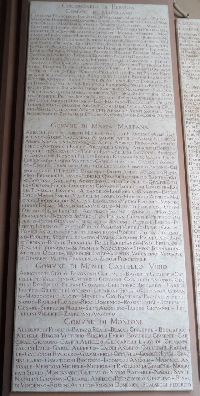 - ISCRIZIONI su tutta la lapide - CIRCONDARIO DI PERUGIA: COMUNE DI MARSCIANO: LANTERNA FRANCESCO-LUCARELLI GUGLIELMO-MACELLARI PIETRO-MAGGIORI DOMENICO-MAGNANINI ANGELO-MANCINELLI CESARE-MANCINI ORESTE-MANGIABENE UBALDO-MARCUCCI GIUSEPPE-MARIORRI GIUSEPPE DI LEOPOLDO-MASSOLI ANDREA-MAZZASETTE PIETRO-MEZZANOTTE PLACIDO-MEZZASOMA GIUSEPPE-MOMMI UMBERTO-MONTAGNOLI FRANCESCO-MORDIVOGLIA GIUSEPPE-MORETTI ROBERTO-MORONI DANTE-NISI LEANDRO-NOFRINI GIUSEPPE-NOSSINI GIUSEPPE-NOSSINI PAOLO-ORLANDI GIO:BATTISTA-PAGANI SEVERINO-PAGNOTTA GIUSEPPE-PALAZZETTI NAZZARENO-PALMERINI GIUSEPPE-PALOMBA ENRICO-PALOMBA NAZZARENO-PAOLUCCI BASILIO-PAPALINI MARSILIO-PASQUALINI AURELIO-PATACCA GIUSEPPE-PECCETTI DOMENICO-PELAGRACCI CESARE-PELAGRACCI ETTORE-PENCELLI GIOVANNI-PERILLI PASQUALE-PERSIANI ANTONIO-PETTINACCI ANSELMO-PETTINACCI FAUSTINO-PIANCINI DIONIGI-PICCIFUOCO ENRICO-PIERAVANTI OTTAVIO-PIETRELLI CARLO-PIOPPI ORESTE-PRELATI TITO-PULITI PIETRO-RAFFINI GUGLIELMO-RAGNI LUIGI-RANOCCHIA CESARE-RENZINI FRANCESCO-RICCERI ANTONIO-RICCI ETTORE DI ANTONIO-RICCI LORENZO-RICCI TITO-RICCI VALENTINO-ROSINUCCI RAIMONDO-ROSSETTI ROMEO-SABATINI ORESTE-SALANI ALFREDO-SANTIBACCI NAZZARENO-SARACCA VIRGILIO-SCALEGGI MARIO-SCORPIONI VITTORIO-SCORTICHINI OLINTO-SEGHETTI PIETRO-SIMONI FRANCESCO-SIMPATIA ANDREA-SOCCOLINI LUIGI-TARMATI DOMENICO-TASSI MARIANO-TOCACCELI FRANCESCO-TODINI EMILIO-TOMASSINI ARTEMIO-TOMASSINI RUFINO-VANNONI EUGENIO-VASELLI CELESTINO-VECCHIETTI ARNALDO-VENTI SAMUELE-VOLPI ILDEBRANDO-ZEPPARELLI ETTORE-ZUCCONI LUIGI-ZUGARINI ANGELO COMUNE DI MASSA MARTANA: ABBATI GIUSEPPE-ABBATI MICHIAR-AGNETTI FRANCESCO-ALBINI CARMELINDO-ALCINI NAZZARENO-ALMADORI ATTILIO-ALMADORI ENRICO-ALMINI NAZZARENO-ALUNNO GIUSEPPE-AMBROGI PRIMO-ANTONELLI EMILIO-ANTONELLI ENRICO-ARCANGELI GIULIO-ANRACNGELI ROBERTO-BECCHETTI NAZZARENO-BECELLI LUIGI-BELLINI GIOVANNI-BENEDETTI SALVATORE-BIONDINI FELICE-BONCIO BONAGGIUNTA MARIO-CARINI FERDINANDO-CARINI MARTINO-CARINI SALVATORE-CATELLA AGOSTINO-CECCHINI FRANCESCO-CRISPOLDI LEONELLO-CRISPOLTI ANTONIO-CRISPOLTI GINO-D’IPPOLITO DOMENICO-DOTTI ANDREA-ELEONORI BENIAMINO-FEDERICI OTTAVIO-FEDERICI QUARTILIO-FEDERICI SANTE-FRATINI FAUSTINO-GALLETTI AGOSTINO-GIULIVI LEONELLO-GIULIVI OTELLO-GRIFONI FELICE-IACCHETTINI GIOVANNI-IACCHETTINI GIUSEPPE-LANCIA TOMMASO-LAURENTI ARCANGELO-LOMBARDINI GIUSEPPE-LUCIONI LUIGI-MANNI EMILIO-MARCELLINI LORENZO-MARCUCCI AQUILIO-MARCUCCI ERMENEGILDO-MARIANI LEONARDO-MEDICI EUGENIO-MONTECCHIANI EREMO-MONTECCHIANI VIRGILIO-MORETTI FEDERICO-OSRINI ORSINO-ORSINI FEDERICI ACCURSIO-PAOLUCCI ANGELO-PAOLUCCI FRANCESCO-PAOLUCCI SEVERO-PAPA ITALIANI GIUSEPPE-PEPPUCCI UMBERTO-PERNI GIOVANNI-PERSICHETTI ANTONIO-PETRELLI ENRICO-PIZZETTI LORENZO-PIZZOTTI PIETRO-POLLIONI VIRGILIO-POMPEI GIUSEPPE-POMPEI SABATINO-PROIETTI FRANCESCO-PROIETTI COSTA COSTANTINO-PROIETTI SCOTTI LEONARDO-PUGLIA GIOVANNI-PULCI CAIO-RAPONI ERMINIO-ROCCHI BERBARDO-ROLLI FERDINANDO-ROSSI FERDINANDO-ROSSINI FERDINANDO-SETTEMBRE NAZZARENO-SIMONI BERNARDINO-STOPPINI ORESTE-TRAPPOLINI LUIGI-VALENTINI VALENTINO-VESCARELLI GIUSEPPE-VIOLINI FRANCESCO-ZENOBI PIERGENTILE COMUNE DI MONTE CASTELLO VIBIO ARRIGHETTI GIULIO-BRUGNOSSI GETTULIO-BUSSOTTI GIUSEPPE-CAPPELLETTI VALENTINO-CATTERINI GIOVANNI-CAVALLETTI ANTONIO-CECCHINI DOMENICO-CERIANI GIOVANNI-CHICCHIERO RICCARDO-FABRIZI ELETTO-GILLECCHI LORENZO-LIPPARONI ERNESTO-LIPPARONI GIOVANNI-MAZZOCCHINI ALCIDE-MEMELLA GIO:BATTISTA-PAZZENERA FERDINANDO-RANIERI FLORIDO-RICCI DOMENICO-ROSSINI LUIGI-SERPERICCI CESARE-SERPERINI NELLO-SILVI AGOSTINO-TASCINI GIOVANNI-TENTELLINI UMBERTO-ZAFFERANI AUGUSTO COMUNE DI MONTONE: ALLEGRUCCI FLORIDO-BATAZZI REALE-BEACCI GIUSEPPE-BECCAFICO MICHELE-BIAGINI VITTORIO-BIAGIOLI EMILIO-BOVICELLI GIUSEPPE-CARDINALI GIOVANNI-CASETTI ALFREDO-CECCARELLI LUIGI FI GIOVANNI-FALCINI LUIGI-GAIOLI ALBERTO-GAIOLI ANGELO-GALLICCHI RAFFAELE-GALLICCHI RUGGERO-GIAMMARIOLI GETTULIO-GORACCI LUIGI-GRASSINI ILARIO-GUASTICCHI RUGGERO-IACOMELLI ANGELO-MANUCCI ANNIBALE-MENICONI MICHELE-MIGLIORATI RUGGERO DI GIUSEPPE-MIGLIORATI SILVIO-MONTANUCCI GETTULIO-NANNI RAFFAELE-NATALISANTE-NATALINI GIOVANNI-ORLANDO AMEDEO-PREZZEMOLO GIUSTINO-RINALDI VINCENZO-ROSSINI ATTILIO-ROSSINI DOMENICO-SCALSEGGI FEDERICO - a incisione -
