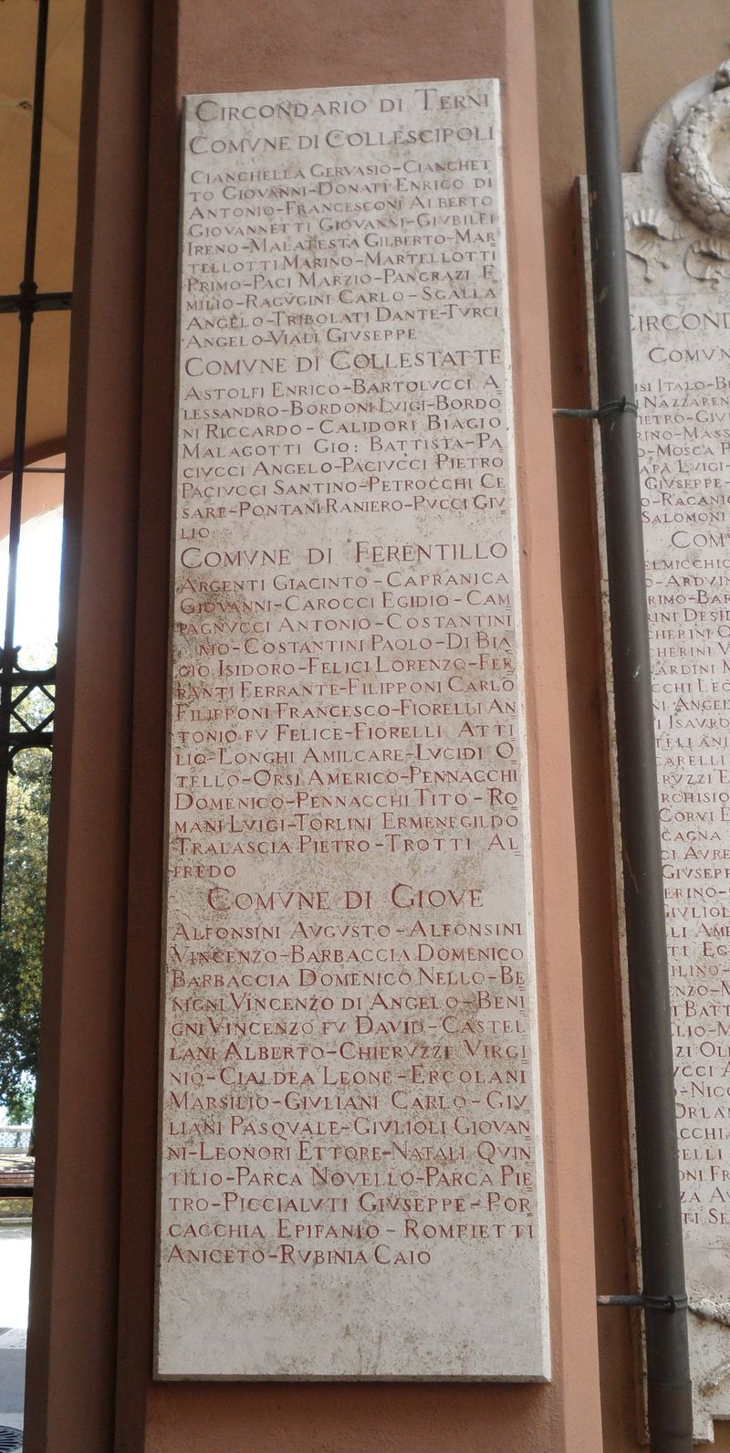 - ISCRIZIONI su tutta la lapide - CIRCONDARIO DI TERNI: COMUNE DI COLLESCIPOLI: CIANCHELLA GERVASIO-CIANCHETTO GIOVANNI-DONATI ENRICO DI ANTONIO-FRANCESCONI ALBERTO-GIOVANNETTI GIOVANNI-GIUBILEI IRENO-MALATESTA GILBERTO-MARTELLOTTI MARINO-MARTELLOTTI PRIMO-PACI MARZIO-PANCRAZI EMILIO-RAGUGINI CARLO-SGALLA ANGELO-TRIBOLATI DANTE-TURCI ANGELO-VIALI GIUSEPPE COMUNE DI COLLESTATTE: ASTOLFI ENRICO-BARTOLUCCI ALESSANDRO-BORDONI LUIGI-BORDONI RICCARDO-CALIDORI BIAGIO-MALAGOTTI GIO:BATTISTA-PACIUCCI ANGELO-PACIUCCIP PIETRO-PACIUCCI SANTINO-PETROCCHI CESARE-PONTANI RANIERO-PUCCI GIULIO COMUNE DI FERENTILLO: ARGENTI GIACINTO-CAPRANICA GIOVANNI-CAROCCI EGIDIO-CAMPAGNUCCI ANTONIO-COSTANTINI (?)MO-COSTANTINI PAOLO-DI BIAGIO ISIDORO-FELICI LORENZO-FERRANTI FERRANTE-FILIPPONI CARLO-FILIPPONI FRANCESCO-FIORELLI ANTONIO FU FELICE-FIORELLI ATTILIO-LONGHI AMILCARE-LUCIDI OTELLO-ORSI AMERICO-PENNACCHI DOMENICO-PENNACCHI TITO-ROMANI LUIGI-TORLINI ERMENEGILDO-TRALASCIA PIETRO-TROTTI ALFREDO COMUNE DI GIOVE: ALFONSINI AUGUSTO-ALFONSINI VINCENZO-BARBACCIA DOMENICO-BARBACCIA DOMENICO NELLO-BENIGNI VINCENZO DI ANGELO-BENIGNI VINCENZO FU DAVID-CASTELLANI ALBERTO-CHIERUZZI VIRGINIO-CIALDEA LEONE-ERCOLANI MARSILIO-GIULIANI CARLO-GIULIANI PASQUALE-GIULIOLI GIOVANNI-LEONORI ETTORE-NATALI QUINTILIO-PARCA NOVELLO-PARCA PIETRO-PICCIALUTI GIUSEPPE-PORCACCHIA EPIFANIO-ROMPIETTI ANICETO-RUBINIA CAIO -