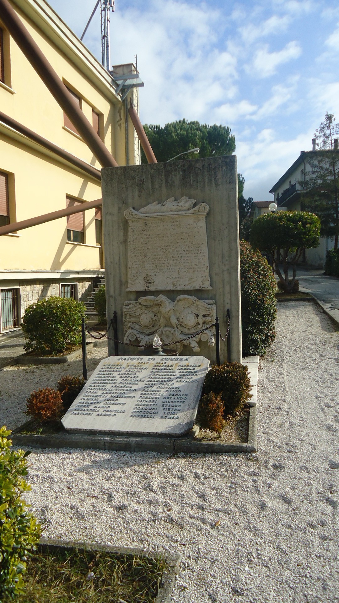- NOTIZIE STORICO CRITICHE Monumento ai Caduti delle due guerre assemblato con lastre commemorative di due epoche differenti su unico basamento di cemento. La struttura è composta da due differenti lastre. La prima è quella dedicata ai Caduti di Valfabbrica della prima guerra mondiale, che in origine era collocata sopra facciata di privato edificio posto in via Roma 2. Dall’analisi dei documenti presenti nell’archivio storico del Comune di Valfabbrica; si scopre che era intenzione degli amministratori inaugurare la lastra nel mese di giugno 1921. In realtà, la lastra riporta la data del 21 agosto 1921. La lastra ai Caduti della seconda guerra mondiale fu ricostruita in occasione della inaugurazione del nuovo monumento ai caduti nel 1990. Originariamente i nomi dei Caduti di entrambe le guerre erano posti sulla facciata dell’edificio comunale quando fu costruito alla fine degli anni ’50. L’edificio comunale stesso fu dedicato ai caduti di tutte le guerre. Nel terreno dove sorge l’edificio comunale, fino al 1950 c’era il Parco della Rimembranza. Si chiamava così perché vi era piantato ogni pino per un caduto di guerra. Nel tempo questi alberi si erano ammalati e furono abbattuti per dare spazio alla costruzione dell’edificio comunale.Tale lastra fu rimossa dopo i lavori di ristrutturazione dell’edificio, dopo gli eventi sismici del 1984. La costruzione di una struttura a vetrata esterna davanti al municipio, rese impossibile la ricollocazione della lastra originaria sulla facciata, optando per un nuovo monumento ai Caduti inaugurato nel 1990 con le due lastre sopra menzionate