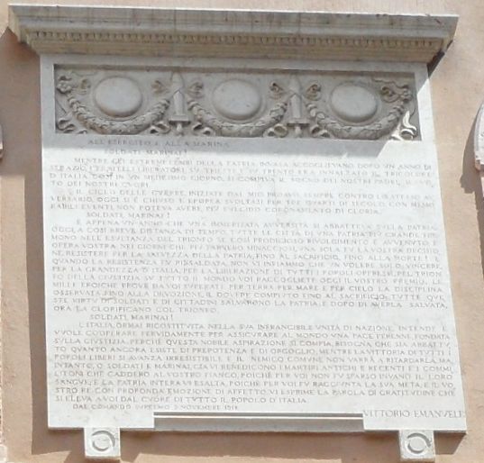 - ISCRIZIONI su tutta la lapide - ALL’ESERCITO E ALLA MARINA – SOLDATI MARINAI ! MENTRE GLI ESTREMI LEMBI DELLA PATRIA INVASA ACCOGLIEVANO DOPO UN ANNO DI STRAZIO I FRATELLI LIBERATORI, SU TRIESTE E SU TRENTO ERA INNALZATO IL TRICOLORE D’ITALIA. COSI’ IN UN MEDESIMO GIORNO, SI COMPIVA IL SOGNO DEI NOSTRI PADRI, IL VOTO DEI NSOTRI CUORI. IL CICLO DELLE GUERRE , INIZIATE DAL MIO PROAVO, SEMPRE CONTRO LO STESSO AVVERSARIO. OGGI SI E’ CHIUSO L’EPOPEA SVOLTASI PER TRE QUARTI DI SECOLO. CON MEMORABILI EVENTI NON POTEVA AVERE PIU’ FULGIDO CORONAMENTO DI GLORIA. SOLDATI MARINAI ! E’ APPENA UN ANNO CHE UNA IMMERITATA AVVERSITA’ SI ABBATTEVA SULLA PATRIA:OGGI, A COSI’ BREVE DISTANZA DI TEMPO, TUTTE LE CITTA’ DI UNA PATRIA PIU’ GRANDE FREMONO NELL’ESULTANZA DEL TRIONFO SE COSI’ PRODIGIOSO RIVOLGIMENTO E’ AVVENUTO. E’ OPERA VOSTRA NEI GIORNI CHE PIU’ PARVERO MINACCIOSI, UNA SOLA FU LA VOSTRA DECISIONE: RESISTERE PER LA SALVEZZA DELLA PATRIA, FINO AL SACRIFICIO, FINO ALLA MORTE ! E QUANDO LA RESISTENZA FU RINSALDATA, NON VI INFIAMMO CHE UN VOLERE SOLO: VINCERE, PER LA GRANDEZZA D’ITALIA, PER LA LIBERAZIONE DI TUTTI I POPOLI OPPRESSI, PEL TRIONFO DELLA GIUSTIZIA SU TUTTO IL MONDO VOI RACCOGLIETE OGGI IL VOSTRO PREMIO. LE MILLE EROICHE PROVE DA VOI SUPERATE PER TERRA, PER MARE E PER CIELO LA DISCIPLINA OSSERVATA FINO ALLA DEVOZIONE, IL DOVERE COMPIUTO FINO AL SACRIFICIO: TUTTE QUESTE VIRTU’ DI SOLDATI E DI CITTADINI SALVARONO LA PATRIA; E DOPO DI AVERLA SALVATA ORA LA GLORIFICANO COL TRIONFO. SOLDATI, MARINAI ! L’ITALIA, ORMAI RICOSTITUITA NELLA SUA INFRANGIBILE UNITA’ DI NAZIONE, INTENDE E VUOLE COOPERARE FERVIDAMENTE PER ASSICURARE AL MONDO UNA PACE PERENNE FONDATA SULLA GIUSTIZIA, PERCHE’ QUESTA NOBILE ASPIRAZIONE SI COMPIA, BISOGNA CHE SIA ABBATTUTO QUANTO ANCORA ESISTE DI PREPOTENZA E DI ORGOGLIO; MENTRE LA VITTORIA DI TUTTI I POPOLI LIBERI SI AVANZA IRRESISTIBILE E IL NEMICO COMUNE NON VARRA’ A RITARDARLA. MA, INTANTO, O SOLDATI E MARINARI, GIA’ VI BENEDICONO I MARTIRI ANTICHI E RECENTI E I COMMILITONI CHE CADDERO AL VOSTRO FIANCO, POICHE’ PER VOI NON FU SPARSO INVANO IL LORO SANGUE; E LA PATRIA INTERA VI ESALTA, POICHE’ PER VOI FU RAGGIUNTA LA SUA META; E IL VOSTRO RE, CON PROFONDA EMOZIONE DI AFFETTO, VI ESPRIME LA PAROLA DI GRATITUDINE CHE SI ELEVA A VOI DAL CUORE DI TUTTO IL POPOLO D’ITALIA. DAL COMANDO SUPREMO 9 NOVEMBRE 1918 – VITTORIO EMANUELE - a incisione -