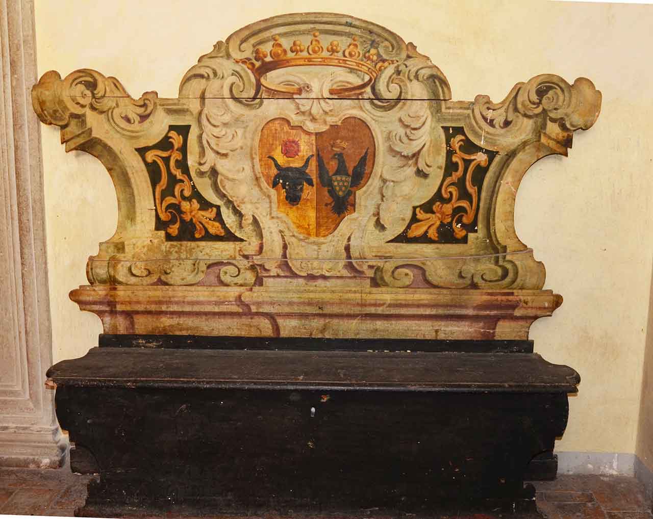 Cassapanca sagomata con schienale, interamente dipinta con motivi decorativi che richiamano finte architetture marmoree; al centro stemma Bufalini sormontato da una corona . La parte inferiore è composta da una seduta con coperchio ribaltabile e serratura, sagomata sia nella parte anteriore che posteriormente