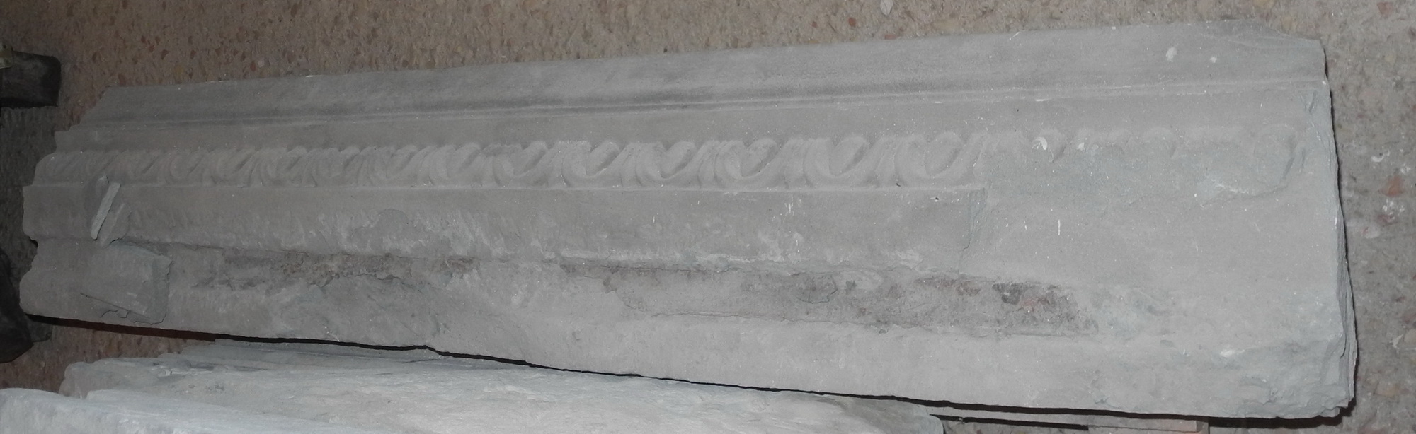 - NOTIZIE STORICO CRITICHE L'elemento avrebbe potuto far parte di un portale o di un camino o, ancora, di una mostra di finestra. La decorazione a ovoli separati da dardi ricorre infatti, all'interno del Palazzo, in numerosi esemplari delle tipologie indicate, anche se in nessuno di essi compare la sola fascia decorata a kyma ionico; si trovano infatti o completamente lisci oppure scolpiti anche nelle fasce superiore e inferiore. Come nella maggior parte degli oggetti conservati nello stesso contesto, non si conosce neanche la data di distacco dalla posizione originaria