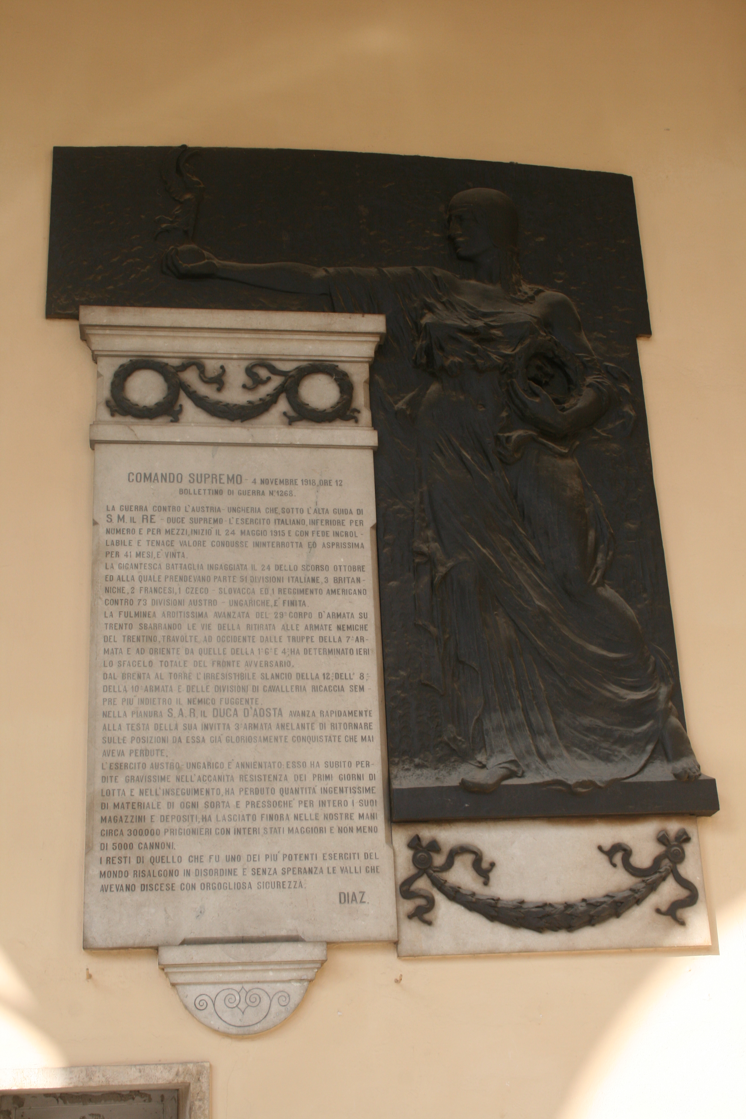 - ISCRIZIONI nel campo - COMANDO SUPREMO - 4 NOVEMBRE 1918, ORE 12/ BOLLETTINO DI GUERRA N. 1268./ LA GUERRA CONTRO L'AUSTRIA-UNGHERIA CHE, SOTTO L'ALTA GUIDA DI/ S. M. IL RE- DUCE SUPREMO - L'ESERCITO ITALIANO, INFERIORE PER/ NUMERO E PER MEZZI, INIZIO' IL 24 MAGGIO 1915 E CON FEDE INCROL/ LABILE E TENACE VALORE CONDUSSE ININTERROTTA ED ASPRISSIMA/ PER 41 MESI, E' VINTA./ LA GIGANTESCA BATTAGLIA INGAGGIATA IL 24 DELLO SCORSO OTTOBRE/ ED ALLA QUALE PRENDEVANO PARTE 51 DIVISIONI ITALIANE, 3 BRITAN/ NICHE, 2 FRANCESI, 1 CZECO-SLOVACCA ED 1 REGGIMENTO AMERICANO/ CONTRO 73 DIVISIONI AUSTRO-UNGARICHE, E' FINITA./ LA FULMINEA ARDITISSIMA AVANZATA DEL 29o CORPO D'ARMATA SU/ TRENTO SBARRANDO LE VIE DELLA RITIRATA ALLE ARMATE NEMICHE/ DEL TRENTINO, TRAVOLTE AD OCCIDENTE DALLE TRUPPE DELLA 7a AR/ MATA E AD ORIENTE DA QUELLE DELLA 1a, 6a E 4a, HA DETERMINATO IERI/ LO SFACELO TOTALE DEL FRONTE AVVERSARIO./ DAL BRENTA AL TORRE L'IRRESISTIBILE SLANCIO DELLA 12a, DELL'8a, DELLA 10a ARMATA E DELLE DIVISIONI DI CAVALLERIA RICACCIA SEM/ PRE PIU' INDIETRO IL NEMICO FUGGENTE./ NELLA PIANURA S. A .R, IL DUCA D'AOSTA AVANZA RAPIDAMENTE/ ALLA TESTA DELLA SUA INVITTA 3a ARMATA ANELANTE DI RITORNARE/ SULLE POSIZIONI DA ESSA GIA' GLORIOSAMENTE CONQUISTATE CHE MAI/AVEVA PERDUTE./ L'ESERCITO AUSTRO-UNGARICO E' ANNIENTATO: ESSO HA SUBITO PER/ DITE GRAVISSIME NELL'ACCANITA RESTISTENZA DEI PRIMI GIORNI DI/ LOTTA E NELL'INSEGUIMENTO, HA PERDUTO QUANTITA' INGENTISSIME/ DI MATERIALE DI OGNI SORTA E PRESSOCCHE' PER INTERO I SUOI/ MAGAZZINI E DEPOSITI, HA LASCIATO FINORA NELLE NOSTRE MANI/ CIRCA 300.000 PRIGIONIERI CON INTERI STATI MAGGIORI E NON MENO/ DI 5000 CANNONI./ I RESTI DI QUELLO CHE FU UNO DEI PIU' POTENTI ESERCITI DEL/ M0NDO RISALGONO IN DISORDINE E SENZA SPERANZA LE VALLI CHE/ AVEVANO DISCESE CON ORGOGLIOSA SICUREZZA./ DIAZ - Armando Vittorio Diaz - capitale -