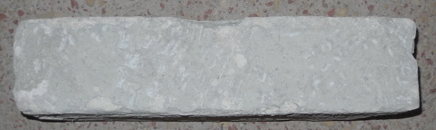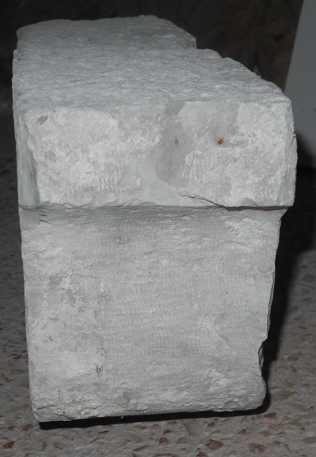 Elemento architettonico frammentario. Sulla parte anteriore un profilo svasato definisce una superficie atta a sorreggere un architrave. La lavorazione a gradina è evidente solo sulla faccia frontale che si qualifica, dall'alto, con una fascia piatta; al centro la zona concavo convessa; in basso un sottile listello