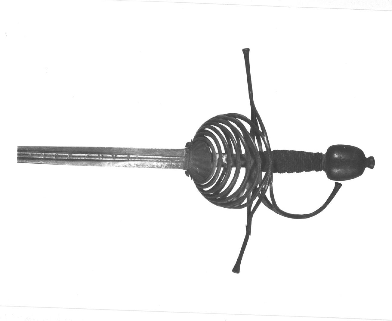 Pomo a barilotto con bottone e basettina, scantonato. Impugnatura rivestita di trecciole in fili d'acciaio rilevate a spina di pesce, fermata da ghiere di trecciole. Fornimento a sette ponti, con guardia e bracci diritti finiti a crescere. Gli elementi sono a sezione tondeggiante e ingrossati al colmo. Alle teste degli archetti è fermata, a vite, una doppia valva, lobata e scanalata. Lama a due taglienti a sezione esagonale con larga scanalatura al forte, poi lenticolare