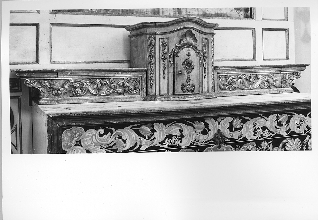 Tabernacolo a facciata leggermente convessa e spigoli smussati. Sulla porticina è un grande ostensorio e, sopra, un'ampia foglia simile a conchiglia. Lateralmente e sulle smussature degli spigoli, entro pannelli rettangolari contornati da esili cornici, scendono dall'alto decorazioni in rilievo a motivi di foglie