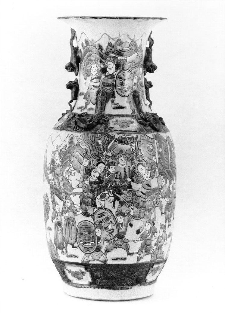 Il grande vaso a balaustro presenta una ricca decorazione policroma su fondo grigio croquele, racchiusa entro fascie di porcellana marrone graffita; il corpo ed il collo presentano animate scene di guerra fra soldati in armatura, appiedati o in groppa a cavalli