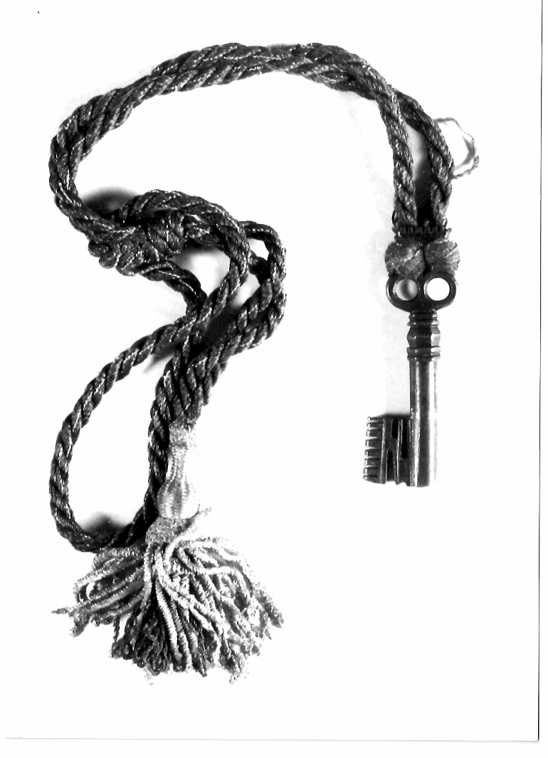 Chiave in ferro battuto tenuta da un lungo cordone terminante con un fiocco