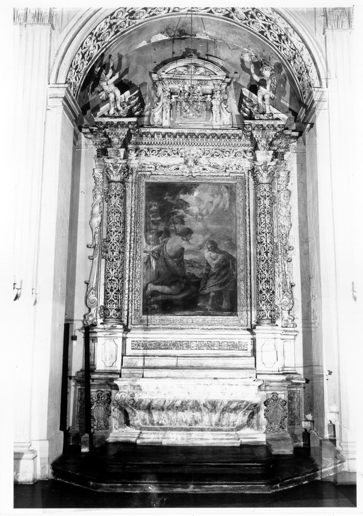 Plinti laterali sovrapposti sui quali poggiano due colonne istoriate da intagli vegetali fuoriuscenti da mascheroni a traforo su scanalature. Capitelli corinzi, lesene a muro affiancate da due cariatidi-arpie. Trabeazione rettilinea con girali, cornici a dentelli e teste di cherubini laterali. Sul timpano due angeli. Al centro cornice tabernacolo centinata tra due telamoni