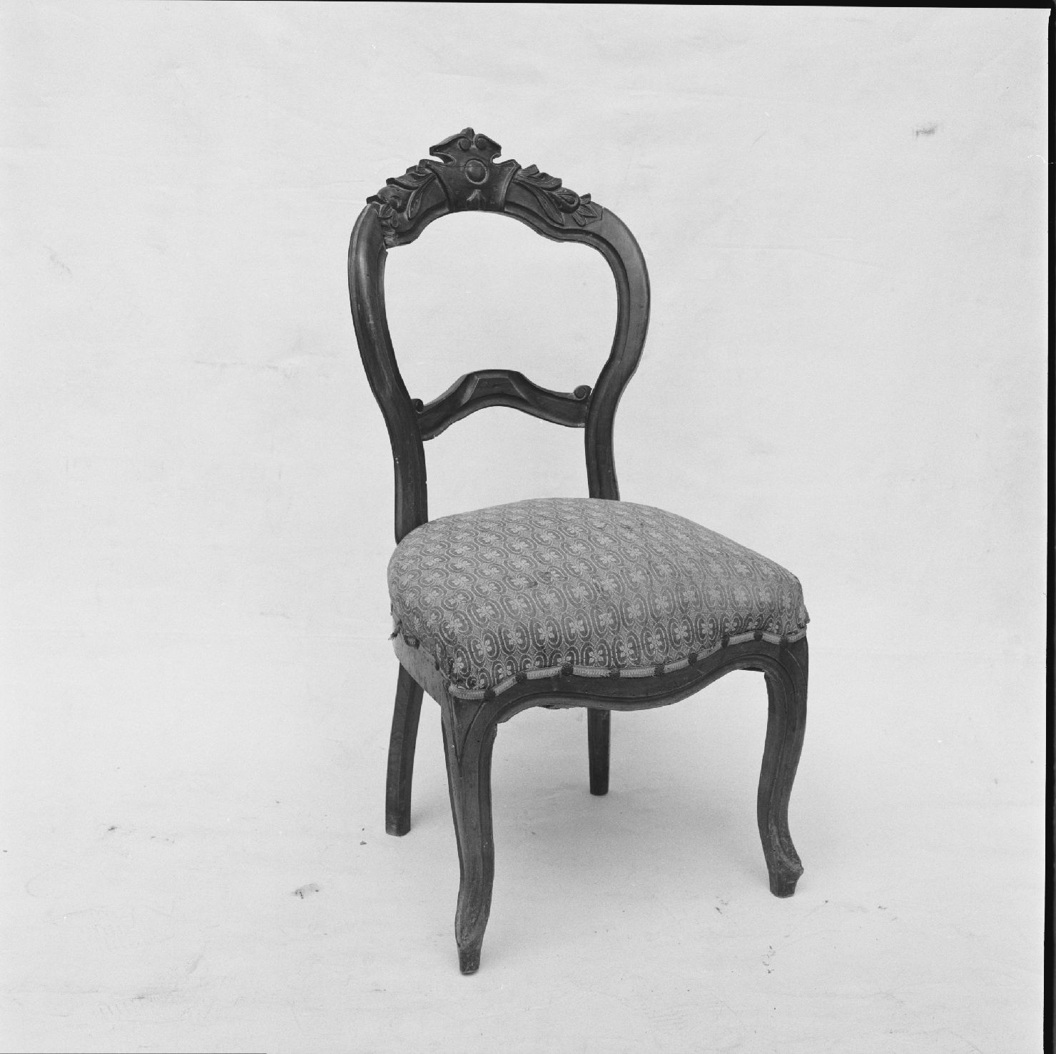 sedia con seduta imbottita, gambe ad esse, schienale decorato da un motivo floreale rocaille